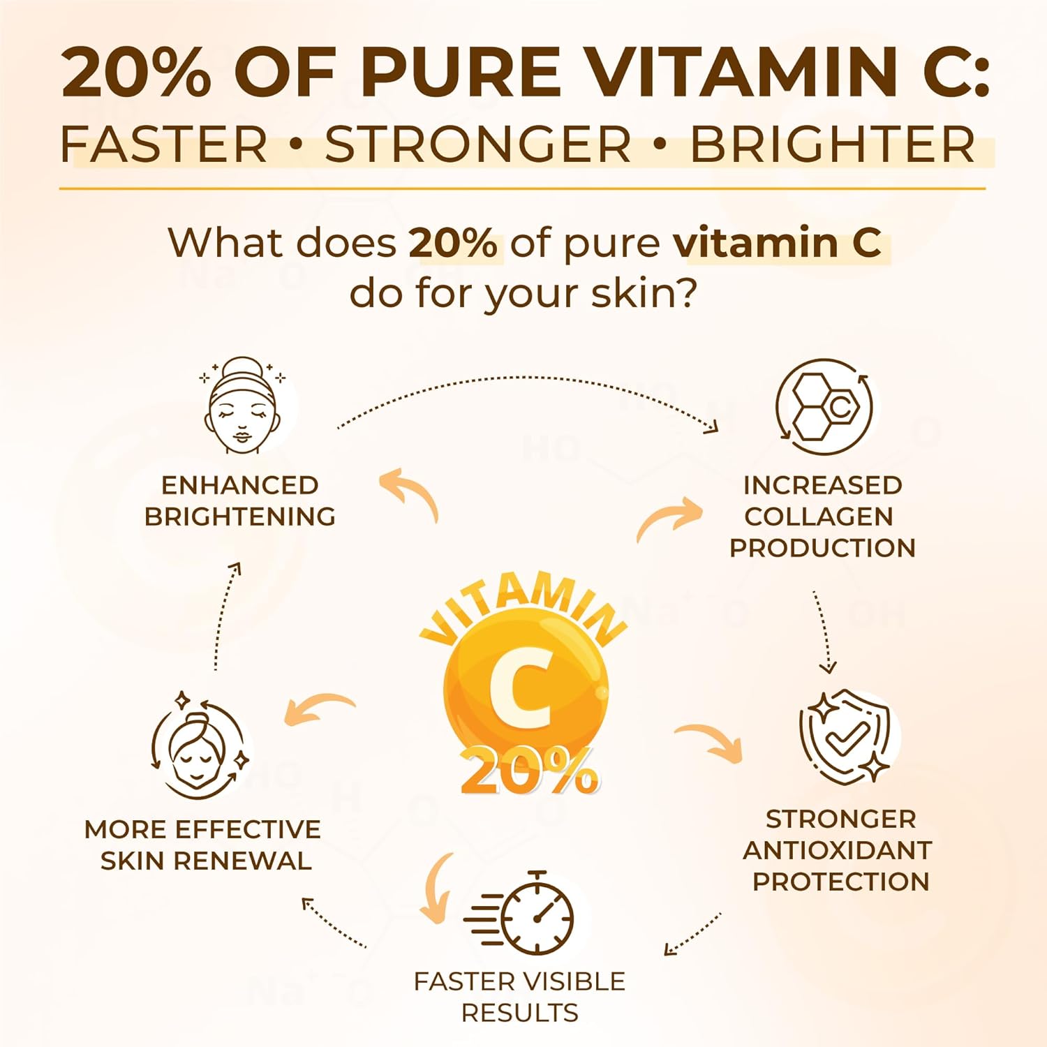 - CLEAN, ALL NATURAL & GENTLE FORMULA: Made with 100% naturally derived ingredientsâfree of parabens, sulfates, and harsh chemicals. This 20% pure Vitamin C face serum combines 6 active boosters (Niacinamide, Hyaluronic Acid, Ferulic Acid, Vitamin E, Peptides, Green Tea) for visible results without irritation.