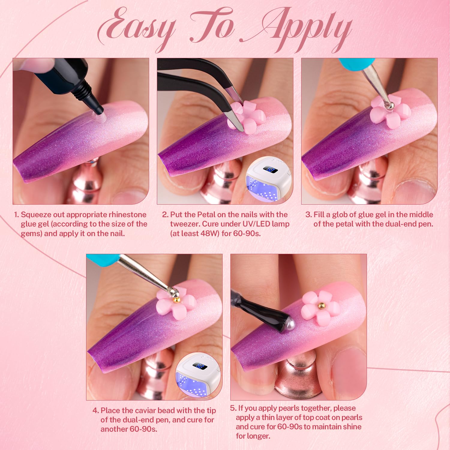 - ✿ Package Content -- It comes with assorted nail charms, including colorful flower nail charms with mini metal caviar beads, 20 pcs butterfly charms, shiny clear & AB glass rhinestones, white half round pearls and small cute diamonds. A tube of 15ml nail charm glue (UV curing needed), tweezers and picking pencil are also equipped for your convenience.
