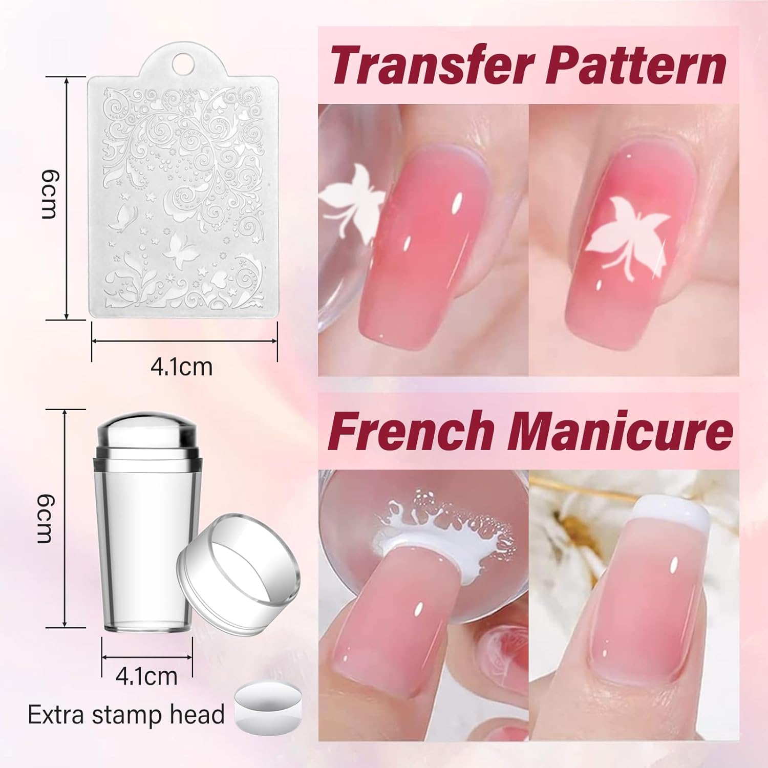 - ăNail Art Stamper & ScraperăThe silicone transparent nail stamper can help you choose the size and position of pattern clearly, and you can see the design and effect on your nail.The clear silicone stamper is flexible and molds smoothly to your nail shape for precise, effortless transfers. It creates a better effect on your nails.