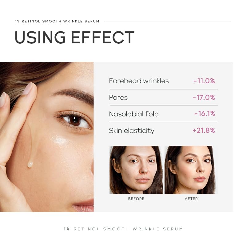 - 【How to Use】After cleansing, apply 2-3 pumps of Retinol Serum to your face and gently pat with your fingertips to aid absorption. Follow with the Retinol Wrinkle Smoothing Moisturizer. For optimal results, use these products in your nighttime skincare routine. If using during the day, remember to apply a facial moisturizer with SPF 30+ to protect the skin from sun sensitivity.
