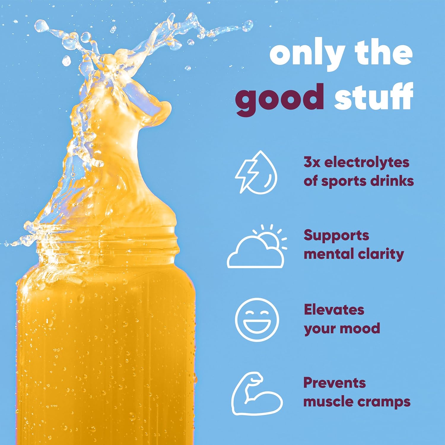 - Product Benefits : Everyday Hydration; Supports Mental Clarity, Focus, and Mood; Prevents Muscle Cramps; Pre and Post Workout; Relieves Dehydration Everyday Hydration; Supports Mental Clarity, Focus, and Mood; Prevents Muscle Cramps; Pre and Post Workout; Relieves Dehydration