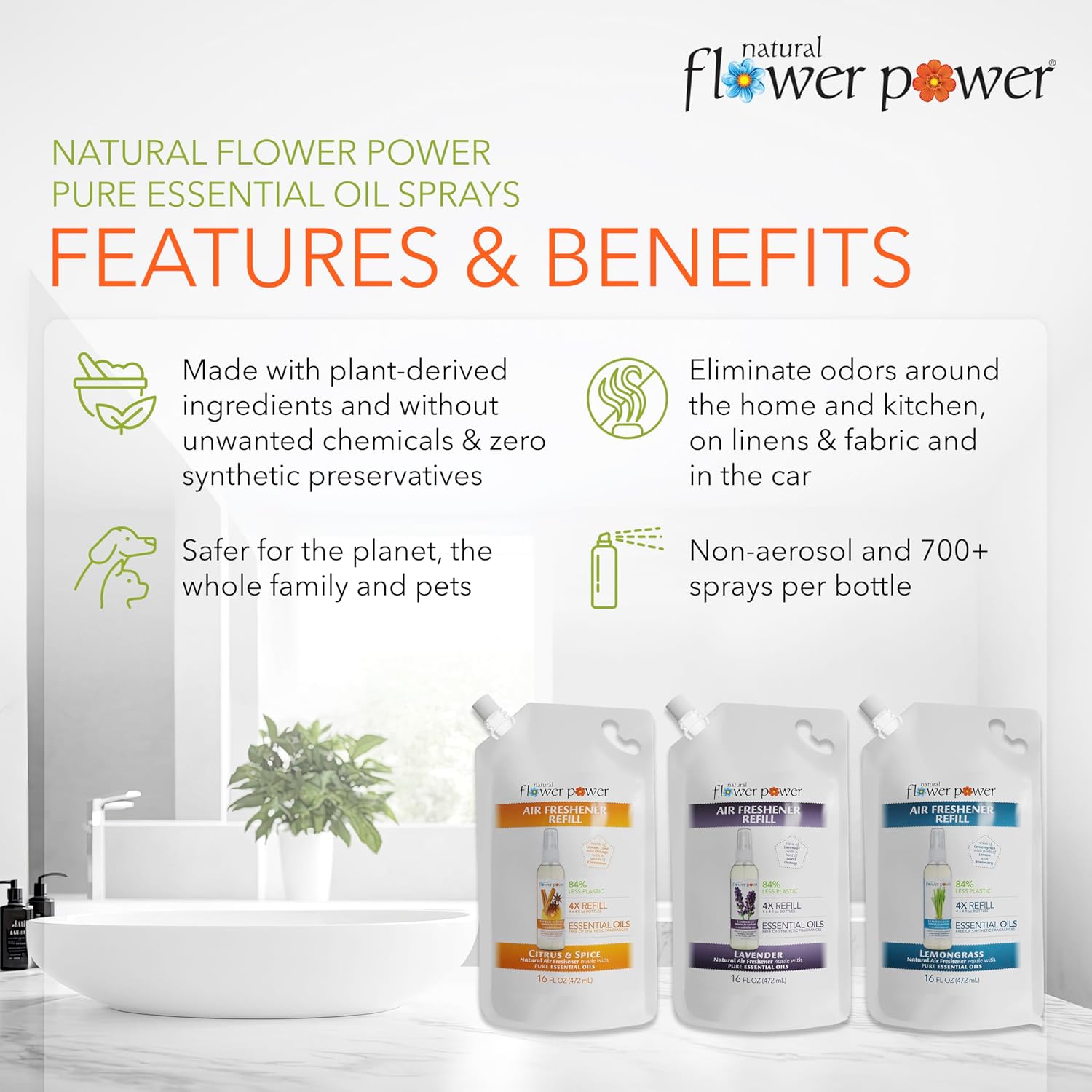 - Refills designed for our non-aerosol spray bottles for fresh, clean-smelling spaces every day - made in the USA