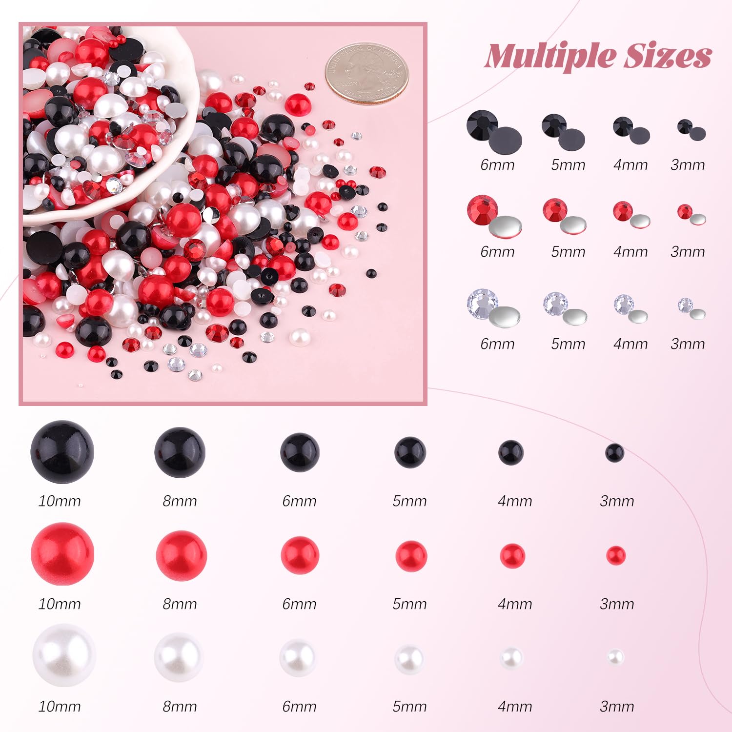80g Flatback Pearls and Rhinestones for Crafting, Red White Black Mixed Size 3-10mm Resin Rhinestones and Half Pearls for Bedazzling, Nail Art and Decoration with Tweezer and Pickup Pencil