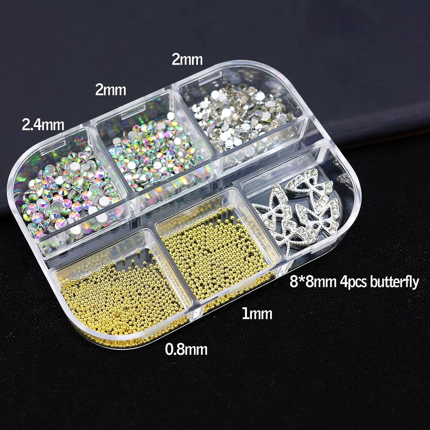 - ăMix Nail RhinestonesăIn another rhinestones box,there is mixing gold nail beads,AB color and white nail gems. There are 4pcs butterfly in small size,which you can apply on long acrylic nails or short nails.