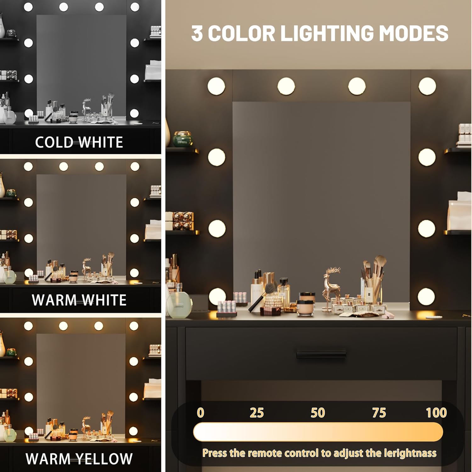 - Clear Mirror & 3 Colors of Lights: Large clear mirror with 10 three-color and brightness adjustable LED bulbs, perfectly adapt to a variety of ambient light, to create the most comfortable makeup environment for you and easy to apply beautiful makeup.
