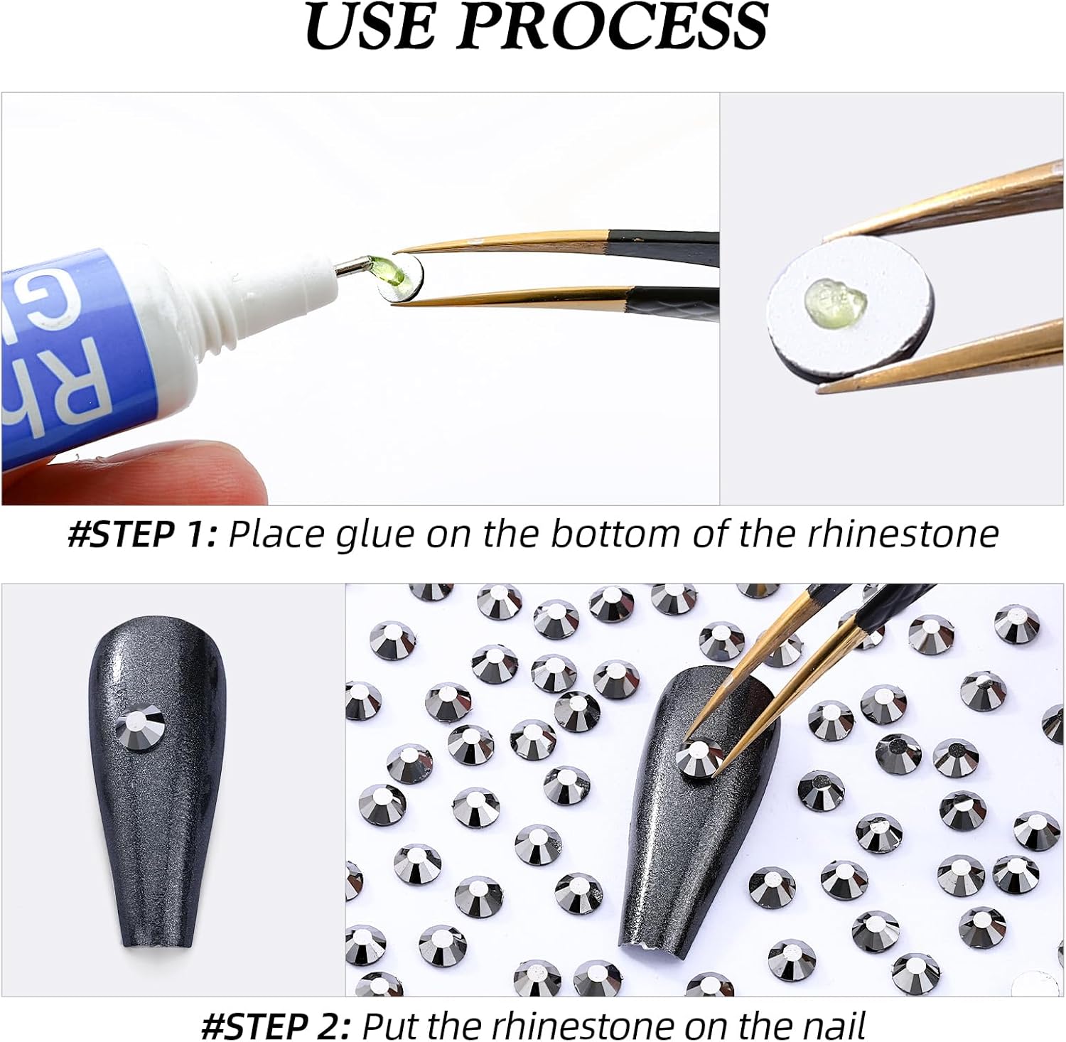 - Use tweezers and Picking Pen gem picker to pick rhinestones, There is no glue on the bottom, additional nail gel is required, or other professional glue for makeup or nails; Can use E6000/E7000 super glue to fix on crafts, art decoration; not hotfix