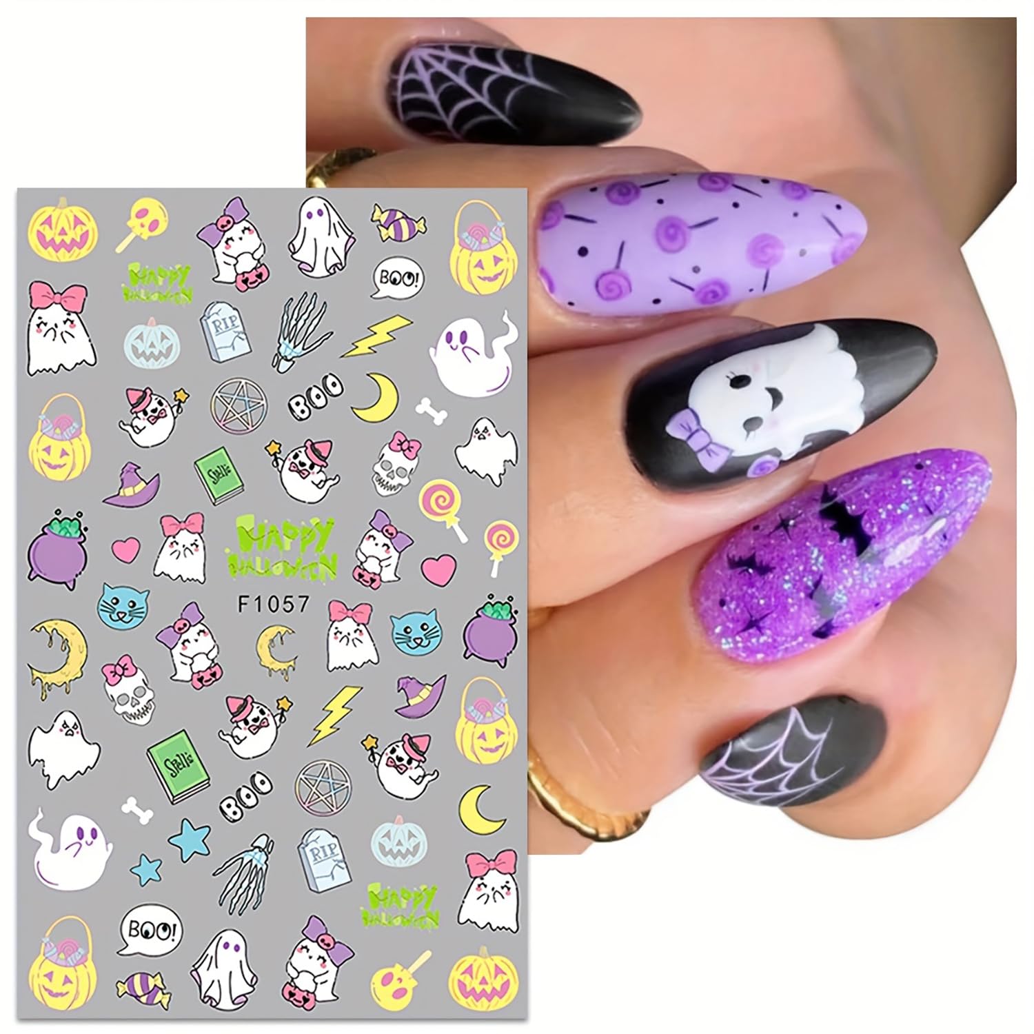 - Variety of Designs: The 5 sheets Halloween nail decals include a range of spooky designs such as cute ghosts, pumpkins, skulls, and spider webs. Achieve a different look every time with these diverse options.