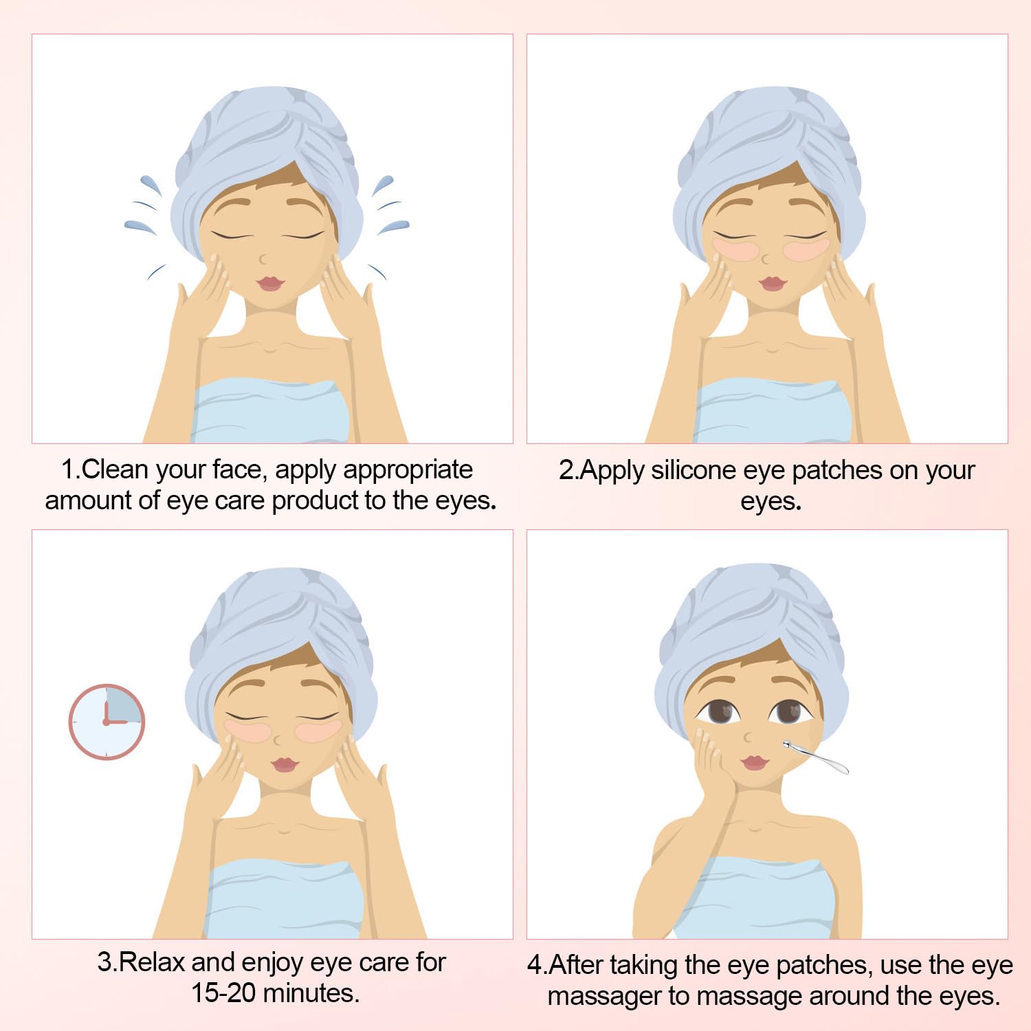 - Easy Application: Clean your face, apply appropriate amount of eye care product to the eyes; Apply silicone eye patches on your eyes; Relax and enjoy eye care for 15-20 minutes; After taking the eye patches, use the eye massager to massage around the eyes.