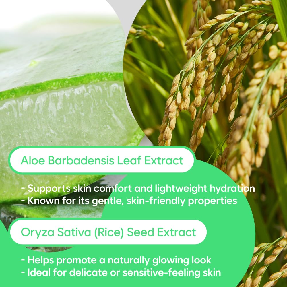 - HYDRATING ALOE VERA & BOTANICALS: Infused with Aloe Vera to replenish moisture and blended with rice, oat, carrot, and coconut extracts to nourish and soothe dry skin.