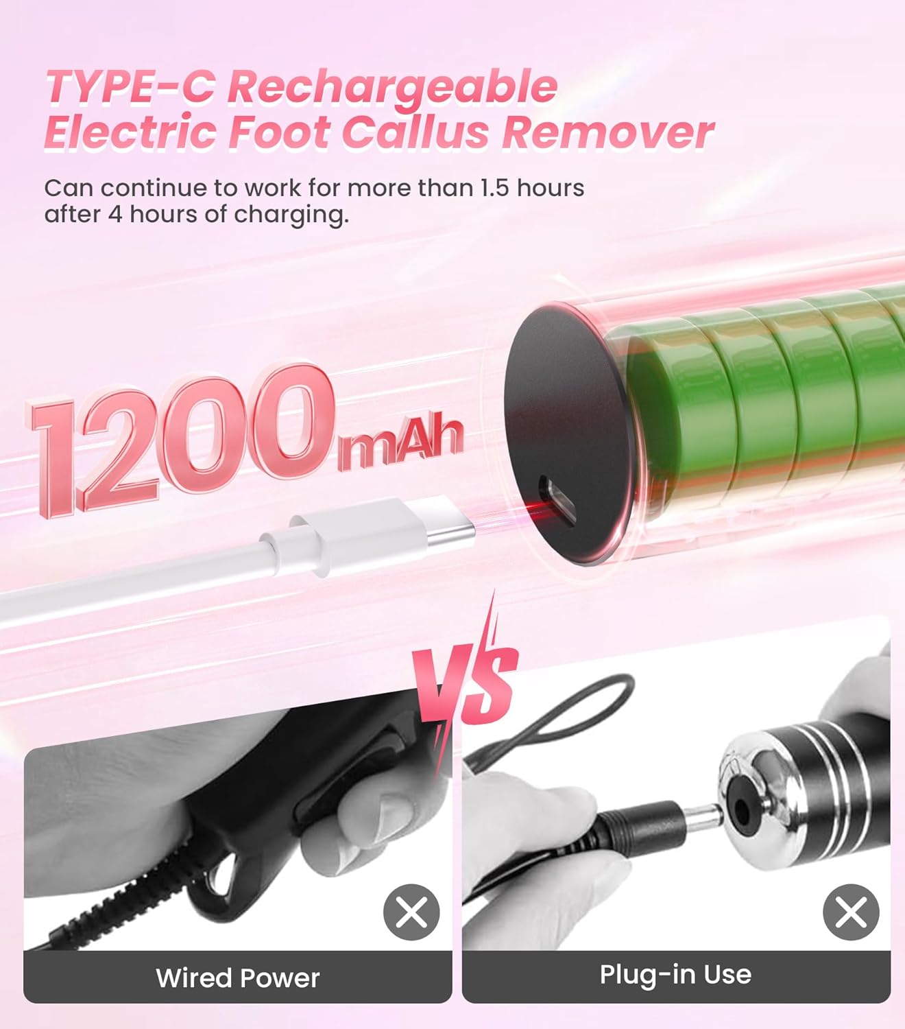 - [POWERFUL BATTERY LIFE] Our electric foot file comes with a 1200mAh battery that lasts more than 1.5 hours of working time after 4 hours of charging. This portable pedicure stone grinder doesn't need to be plugged in to use, you can experience pedicure anytime, anywhere, it's a perfect tool to remove dead skin from your feet quickly and easily.