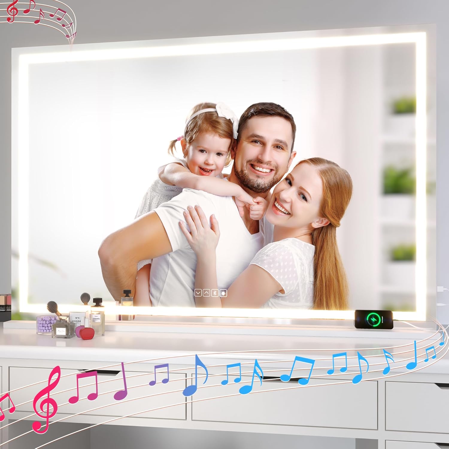 Hasipu Vanity Mirror with Lights and Bluetooth Speaker, 50" x 33.9" LED Makeup Mirror, Lighted Makeup Mirror with Dimmable 3 Modes, Touch Screen Control Vanity Mirror Square White