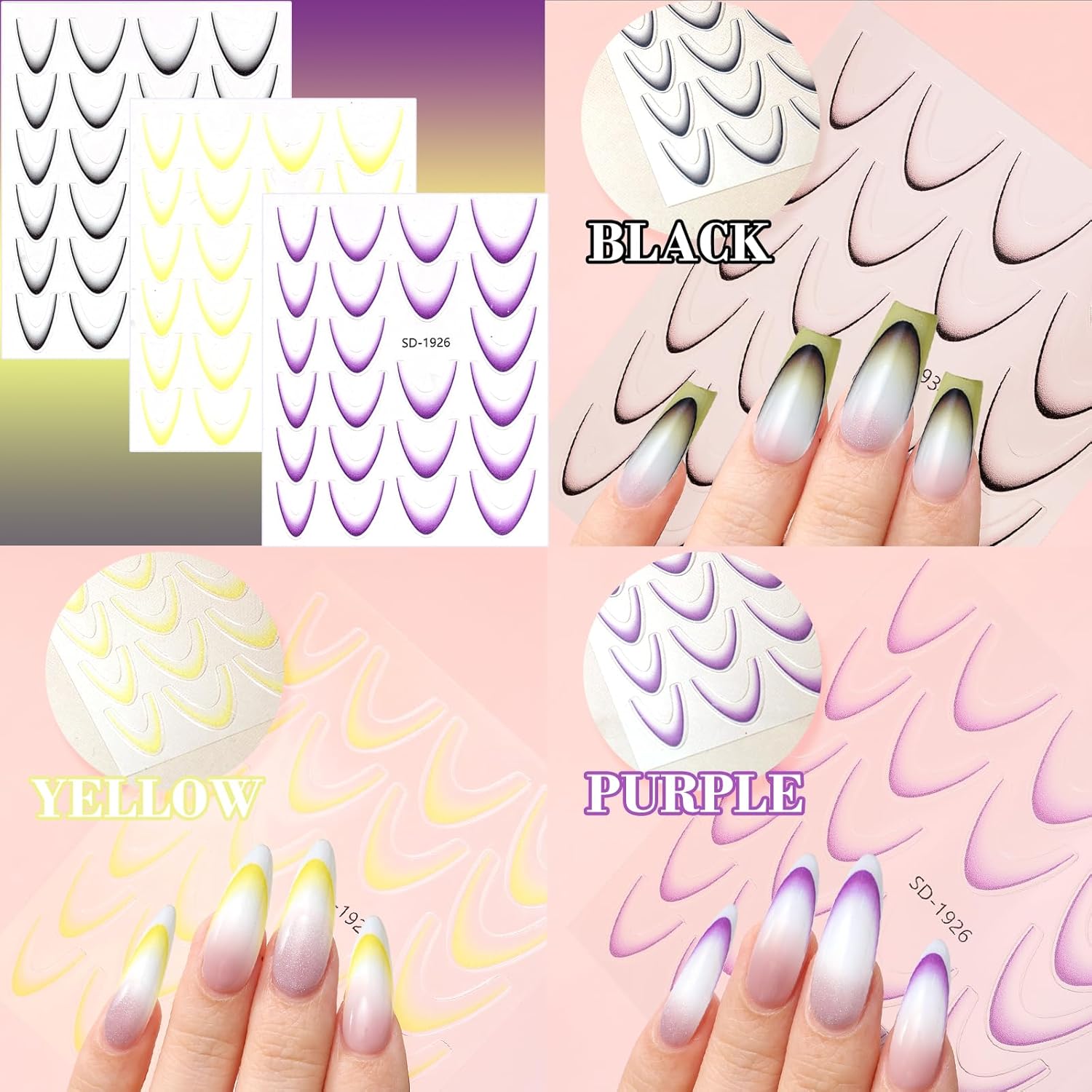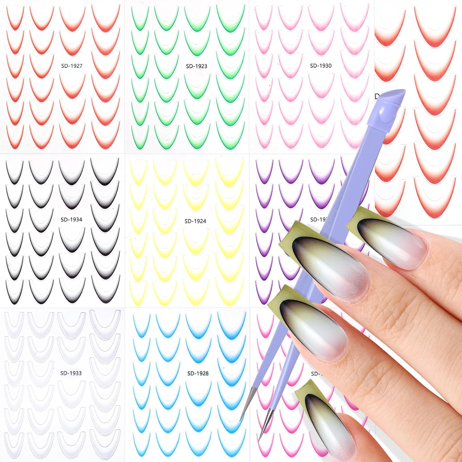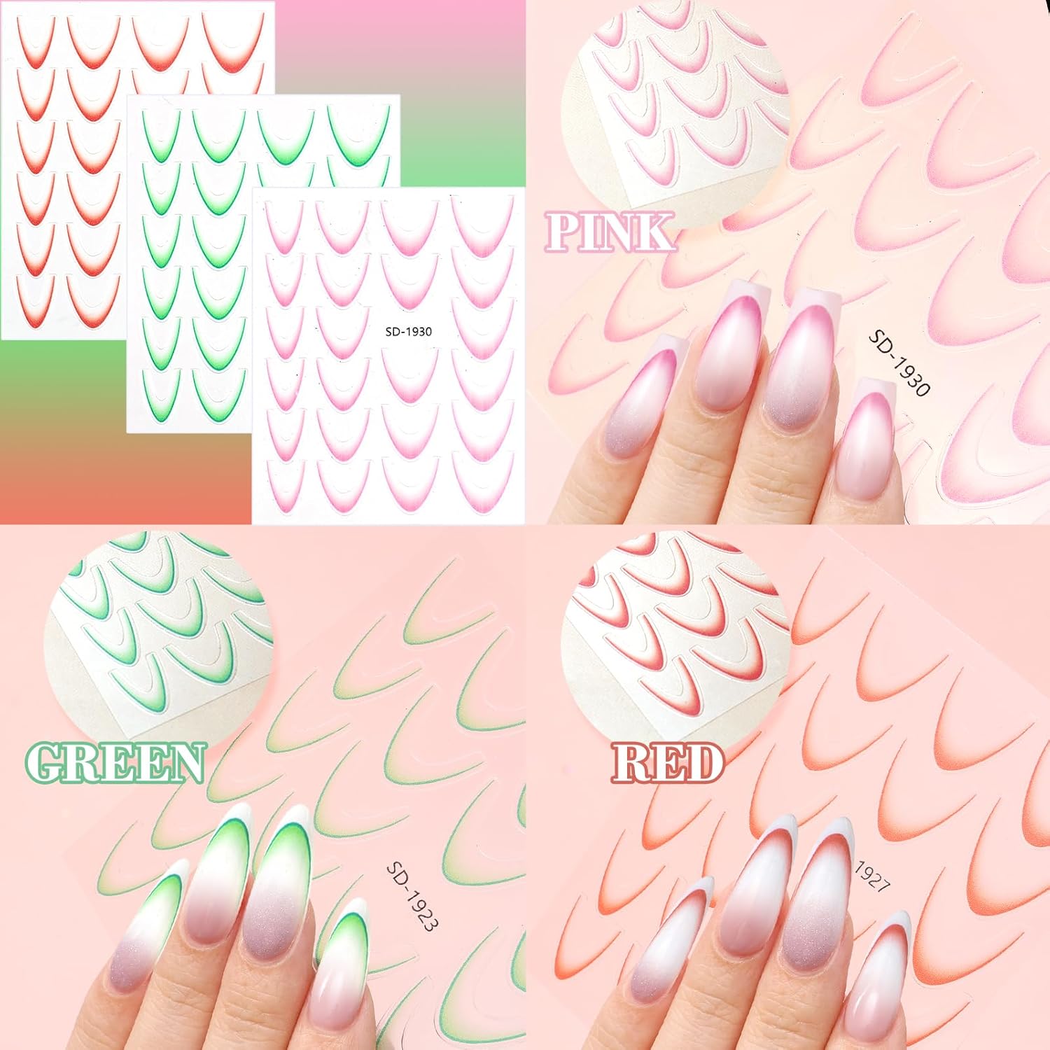 - ă3D Gradient French Tip StickersăYou will receive 9 sheets 3D French nail stickers in different colors, each with French line patterns of different sizes. Gradient French nail stickers and decal stripe designs combine popular elements, with simple design and rich colors, enough to satisfy your various French nail designs.