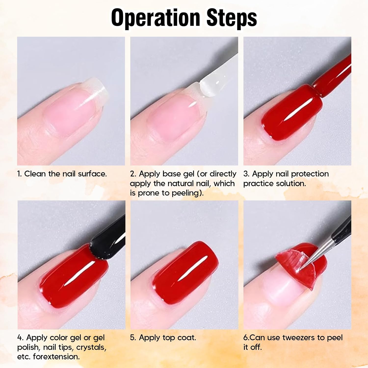 - Base Coat: You will get 15ml Large Capacity Peel-Off Base Gel.Suitable for frequent style changes, can be removed immediately after nail art practice or styling. You can easily remove nail tips with gel or acrylic extensions practiced on a nail care practice solution.