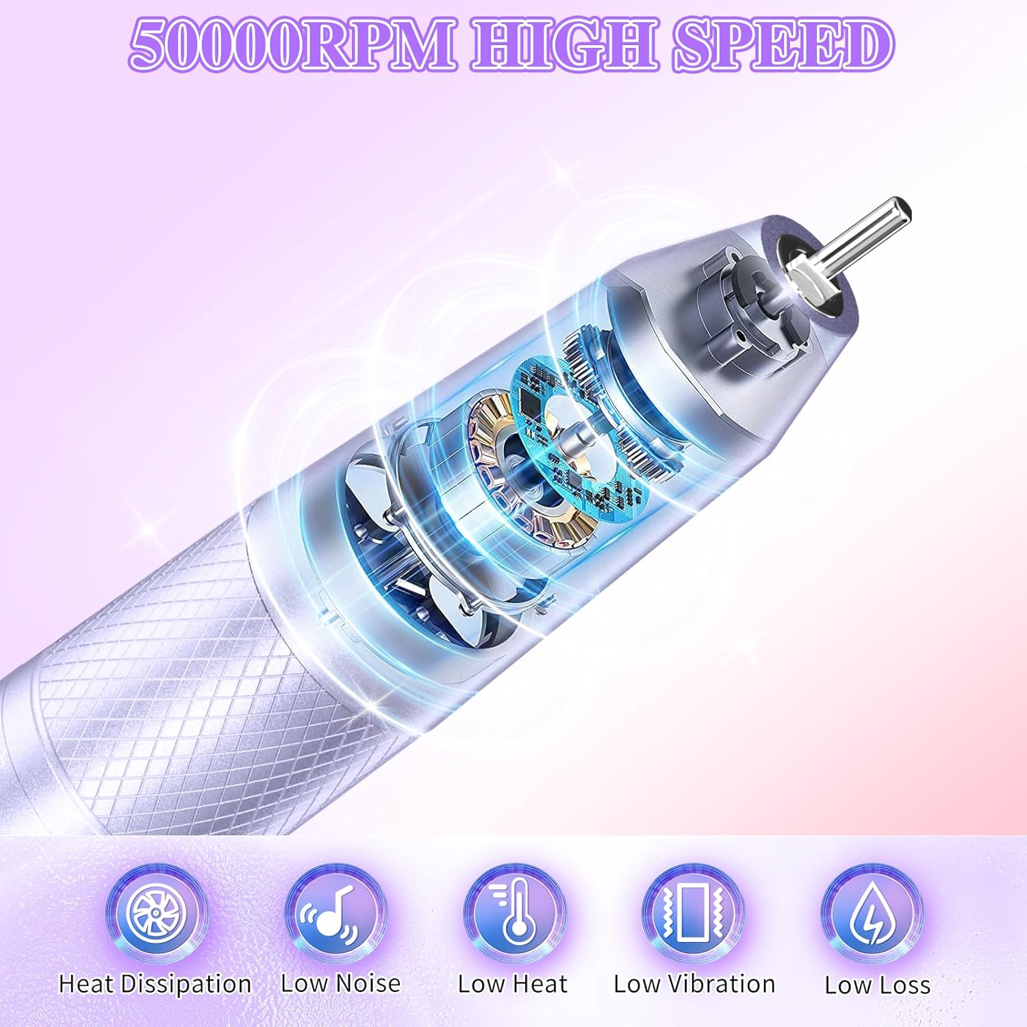 - 【Low Vibration & Heat & Noise】This electric nail drill with high speed that is up to 50000RPM, It adopts an efficient cooling system and an aircraft-grade aluminum alloy structure, which can reduce vibration, quickly dissipate heat, run smoothly, and maintain long-lasting It is comfortable to hold and not hot to hold.