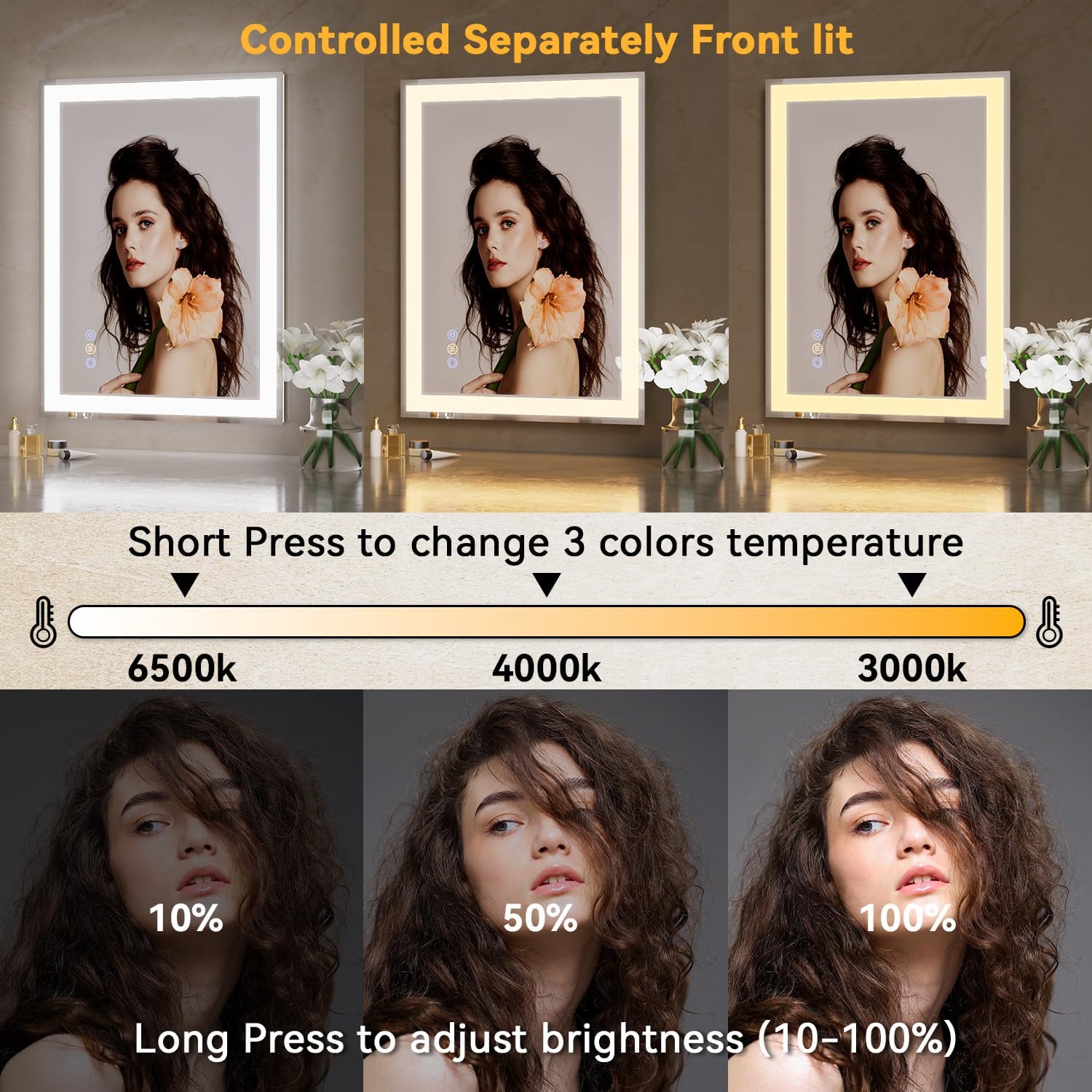 - 【Separate Front & Backlit Control with Dimming】This LED bathroom mirror features 3 adjustable color temperatures (3000K / 4000K / 6500K) and dimmable brightness (10%–100%). Front and back lights can be controlled separately. Short press to switch color temperature and turn lights on/off. Long press to adjust brightness. Unlike most mirrors, our button light can be turned off — no more glowing at night