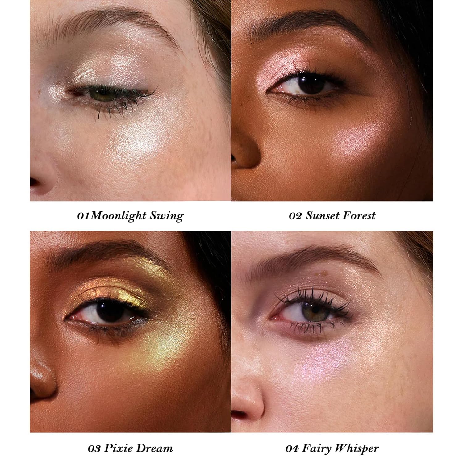 - 04 Fairy Whisper-Pink+Lilac+Mint: 04 features a multichrome highlighter with delicate pink,lilac,and mint shimmers,adding an enchanting and playful touch to your makeup