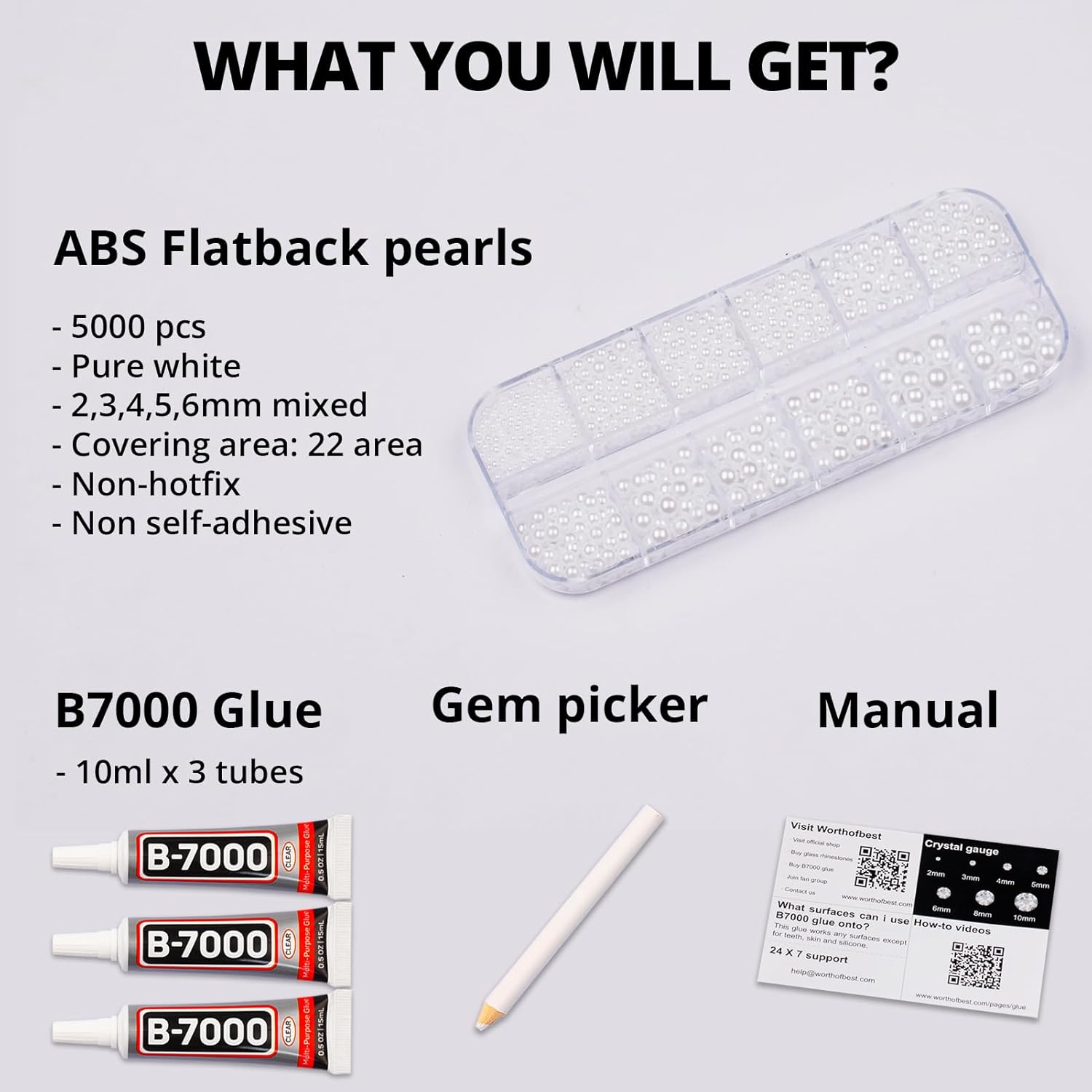 - Package Content with Tool (pickup pen and manual) -- The bedazzler kit Package includes 1 white half pearl set with 12 grids, approx. 5000 pcs of 2,3,4,5,6mm ABS flatback pearls