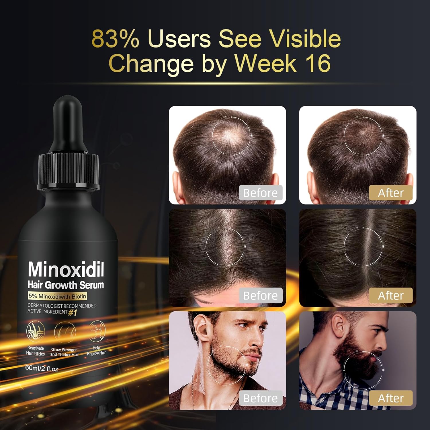 - POWERFUL HAIR GROWTH SERUM FOR MEN AND WOMEN: Transform your hair with our advanced hair growth serum crafted with 5% Minoxidil. Clinically proven to stimulate hair regrowth, this powerful formula revitalizes thinning hair and promotes visibly thicker, fuller, and healthier hair for both men and women. Experience real results in as little as 8-12 weeks with consistent use, with full results typically visible after 3-6 months. Continued use is recommended to maintain hair regrowth for men and women.