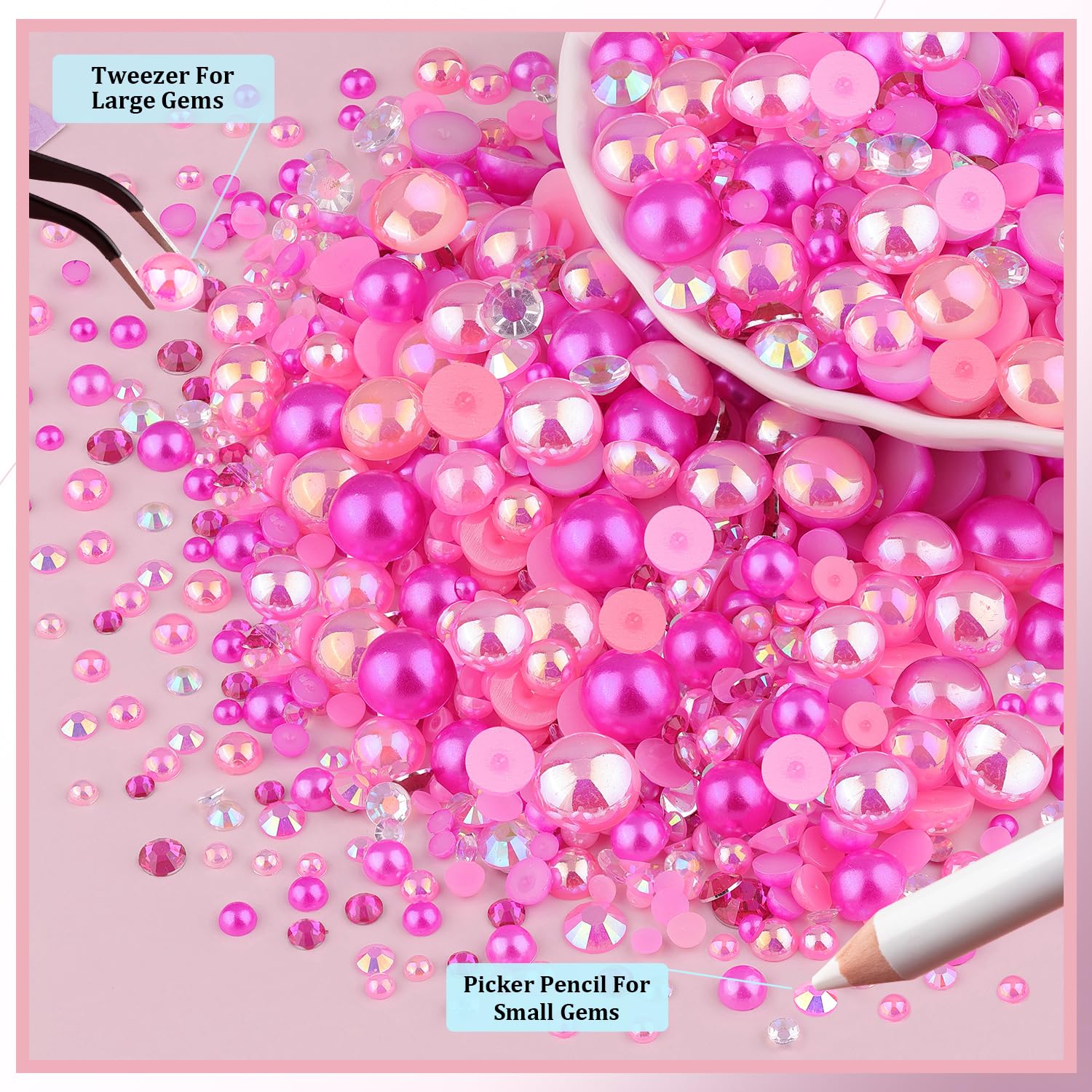 9000Pcs Flatback Pearls and Rhinestones for Crafting, Hot Pink Light Pink Mixed Size 3-8mm Resin Rhinestones and Half Pearls for Bedazzling, Nail Art with Tweezers and Pickup Pencil