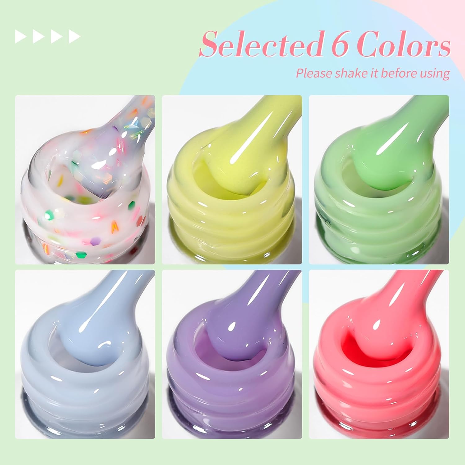 Born Pretty Jelly Pastel Gel Nail Polish 6 Colors Spring Summer Yellow Green Blue Purple Pink Candy Sweet Colors Apex Building Effect Gel Polish Kit Nail Art Gel Manicure Kit DIY at Home Salon Gifts