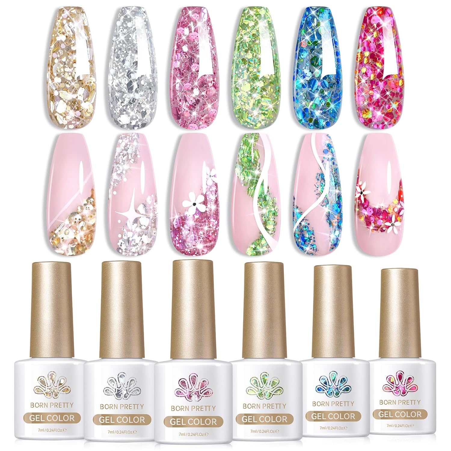 Born Pretty Glitter Gel Nail Polish with Sequins, 6 Pcs Gold Silver Purple Green Blue Hot Pink Long Lasting Sparkly Shiny U V Gel Polish Set for Manicure and Nail Art, DIY at Home, Salon-Quality 7ml