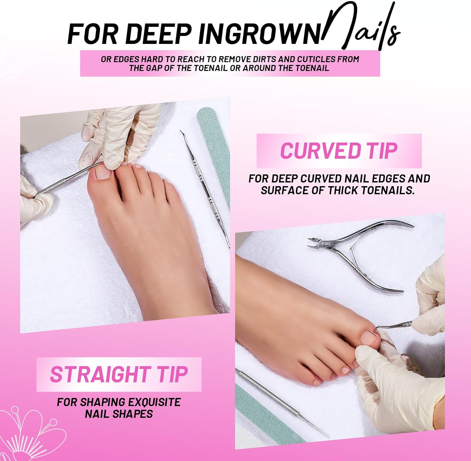 - Nail Lifter Ingrown Toenail Tools Kit: The ingrown toenail lifter is designed with the angled heads that can lift the nail corners to reach nail edge easily and remove the stubborn debris effortlessly. It helps to get rid of the pain and discomfort caused by ingrown toenails. The stainless steel nail file consists of a straight end for filing the outer flat surface of the nails and a curved end for trimming the curved surface, nail edge and nail corners. Practical nail tools for pedicure.