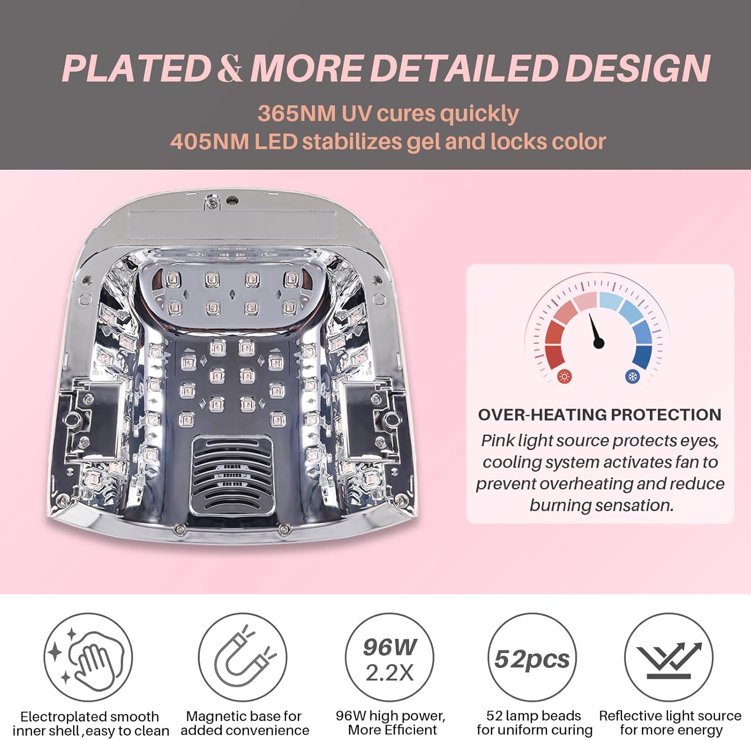 - DUAL LIGHT SOURCE & 52 BEADS - 52 LEDs(365nm+405nm), Using advanced UV LED double light source bulb technology to cure all kinds of nail gel;96 watts of power offers 90% faster curing speeds than lower wattage UV nail lamp.