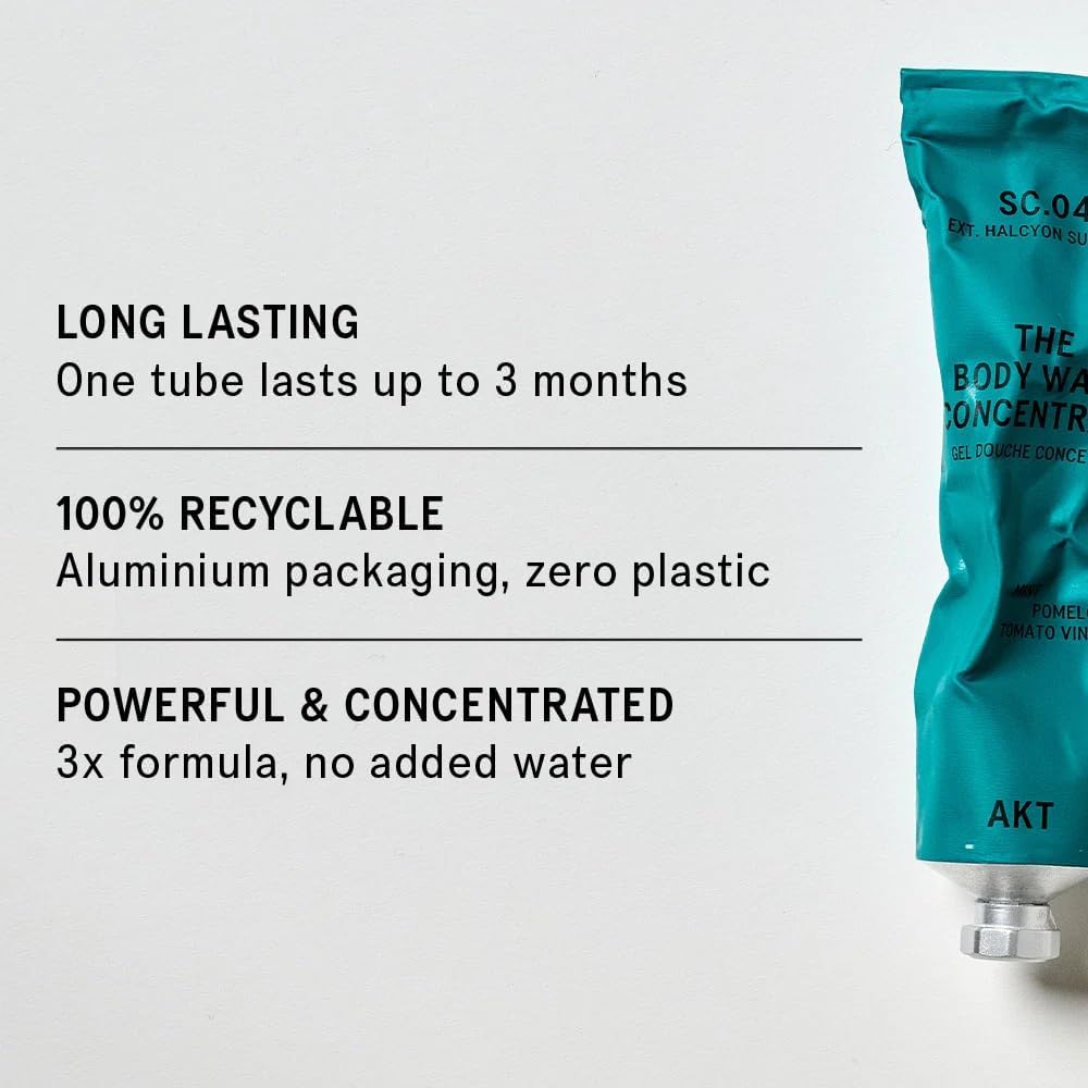 - Plastic-Free, Vegan Body Wash in Aluminium Tube: Made in the UK, this concentrated wash is housed in a 100% recyclable aluminium tube. Itβs certified vegan and cruelty-free β a conscious, sustainable choice that fits effortlessly into your daily performance ritual.