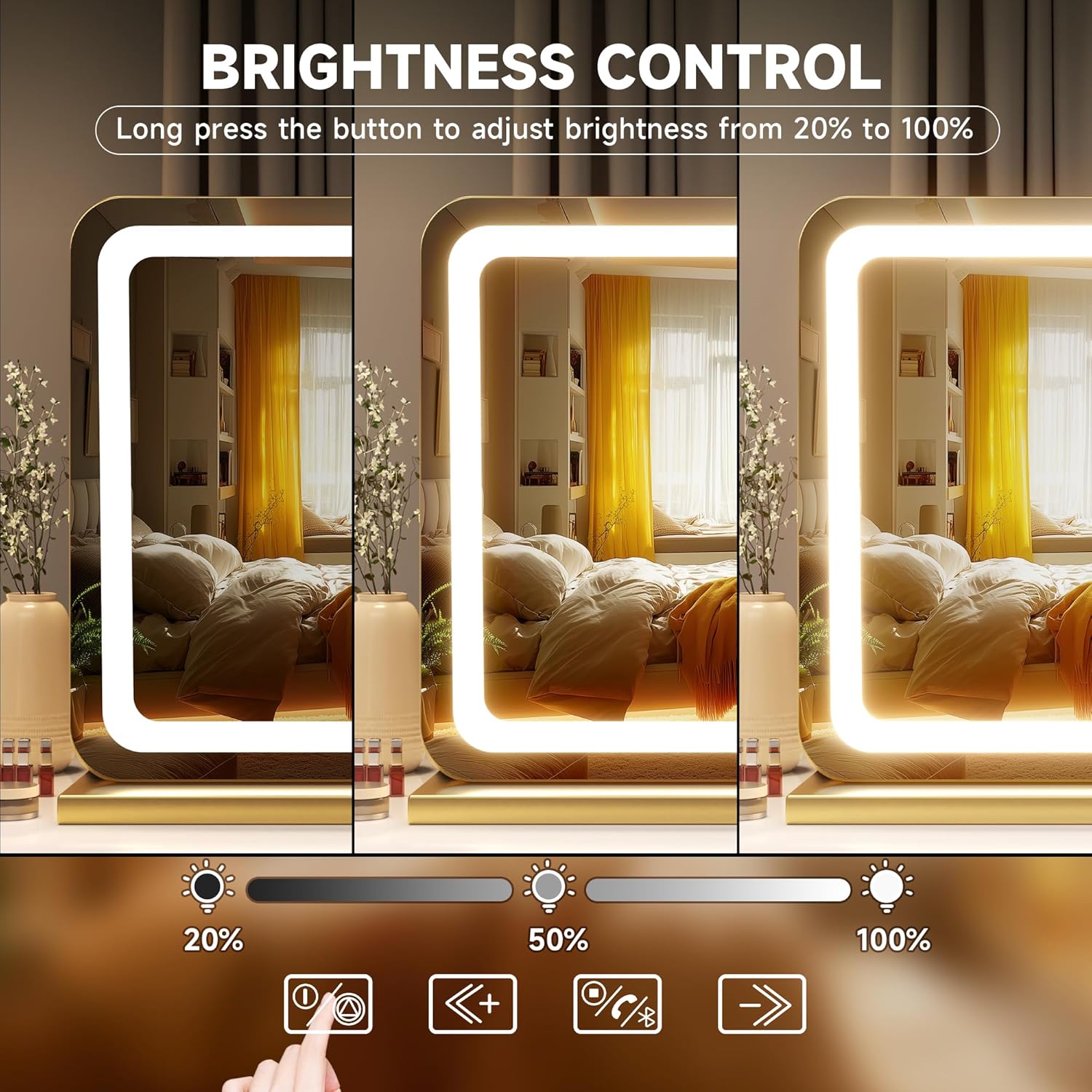 - 👍【Smart Touch Control & Memory Function】This makeup mirror with lights has 3 smart touch buttons, turn on/off the light by touching the sensor switch, press the left button to change the color modes, and long press the right button to adjust the LED brightness. This lighted makeup mirror is designed for memory function and keeps your lights set like last use.