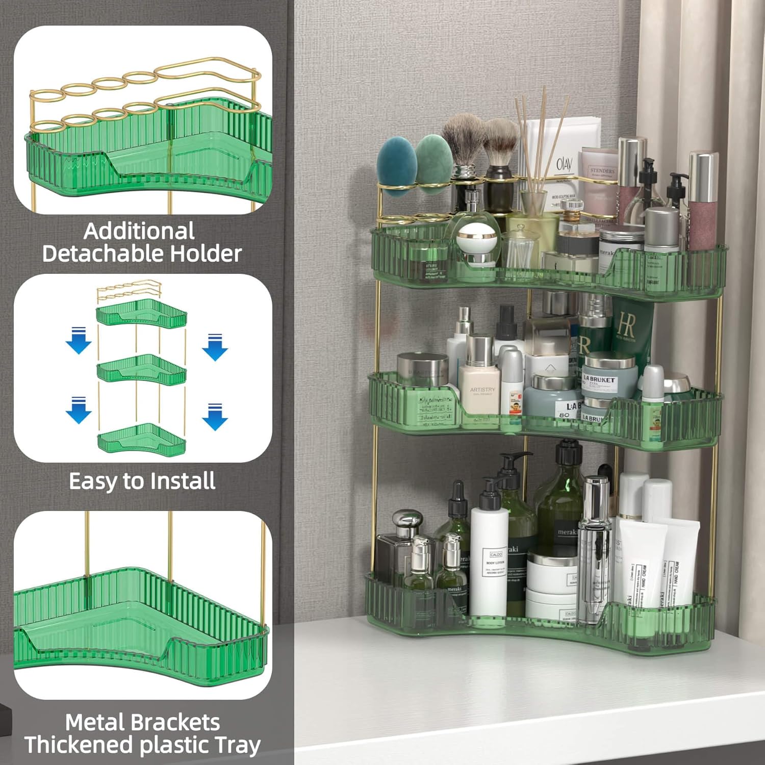 3 Tier Corner Bathroom Organizer Countertop, Vanity Makeup Organizer with Brush Holder, Space-Saving Skincare Storage Corner Shelf for Bathroom, Dressing Table, Kitchen