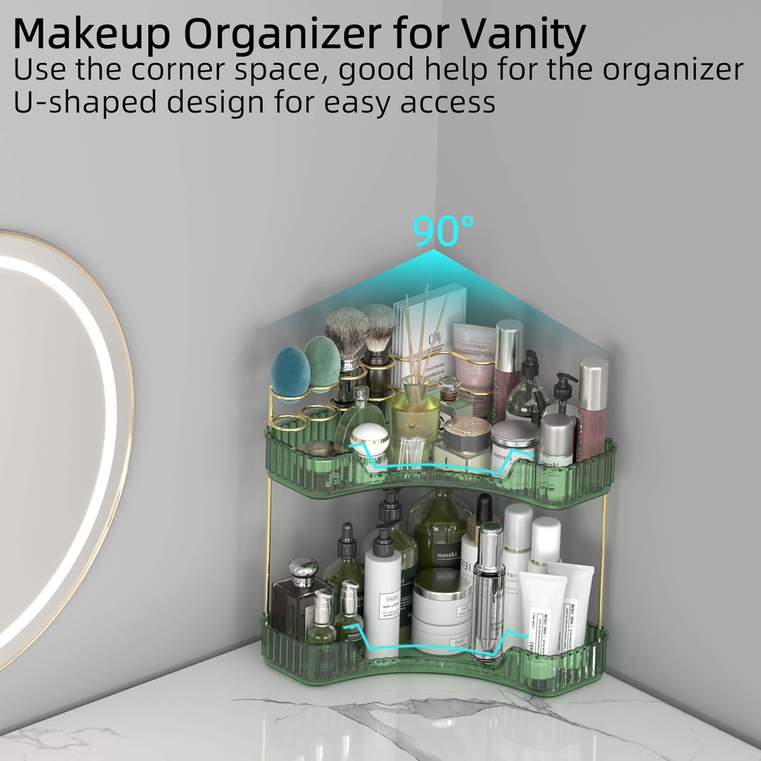 - ă90° Corner Bathroom Counter OrganizerăThe 90° quarter-circle design maximizes the unused space that snugly fits bathroom/vanity corners. Multi-layer structure adds 100% vertical storage while occupying minimal counter space.