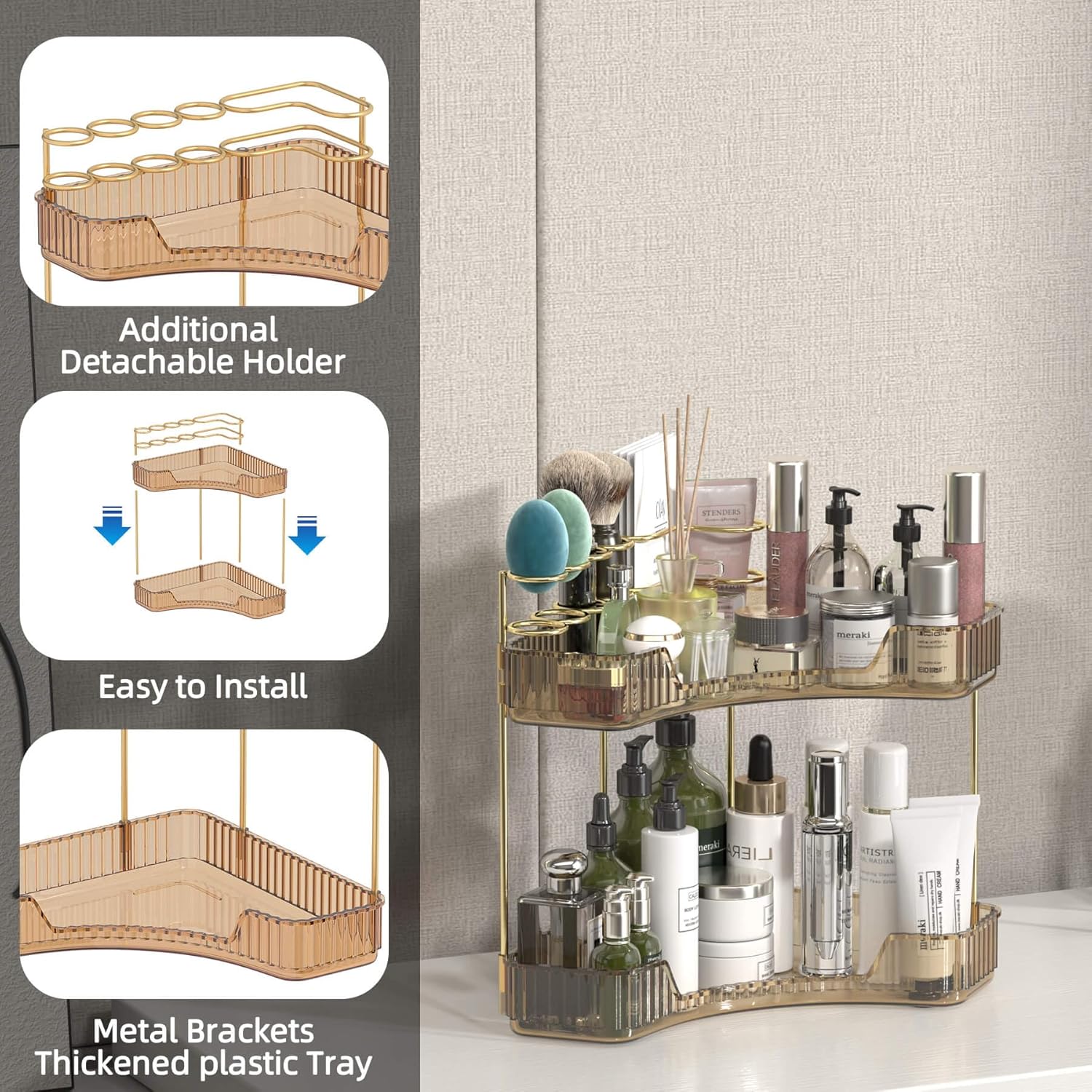 Corner Bathroom Counter Organizer with Top Toothbrush Holders, 2-Tier Make Up Organizers for Vanity with Brush Holder, Corner Storage for Bathroom, Kitchen, Dresser