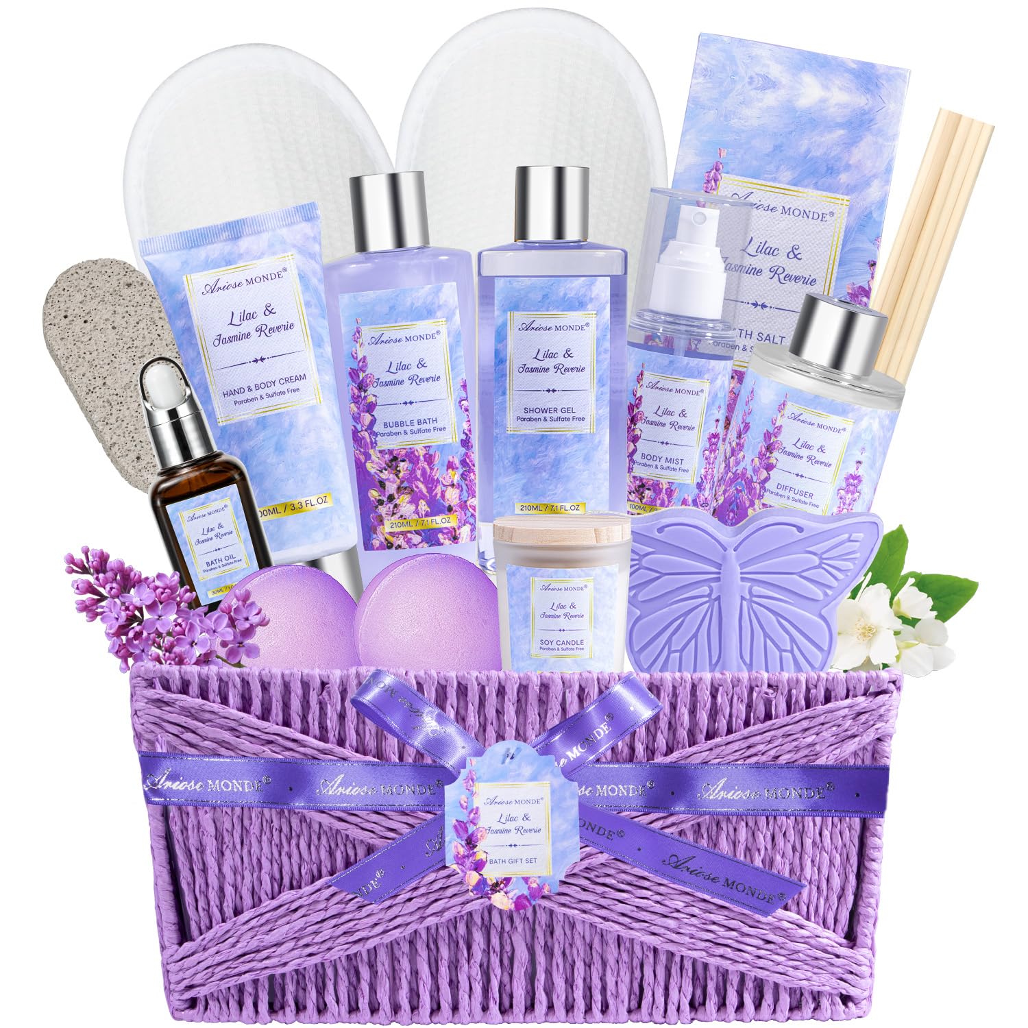 Gift baskets for women, 15Pcs Lilac Women Bath Gift Baskets w/Body Mist, Diffuser, Bath Bomb. Unique Relaxing Spa Gift Basket Set, Mothers Day Gifts for Mom Wife Grandma Daughter Friends Sister