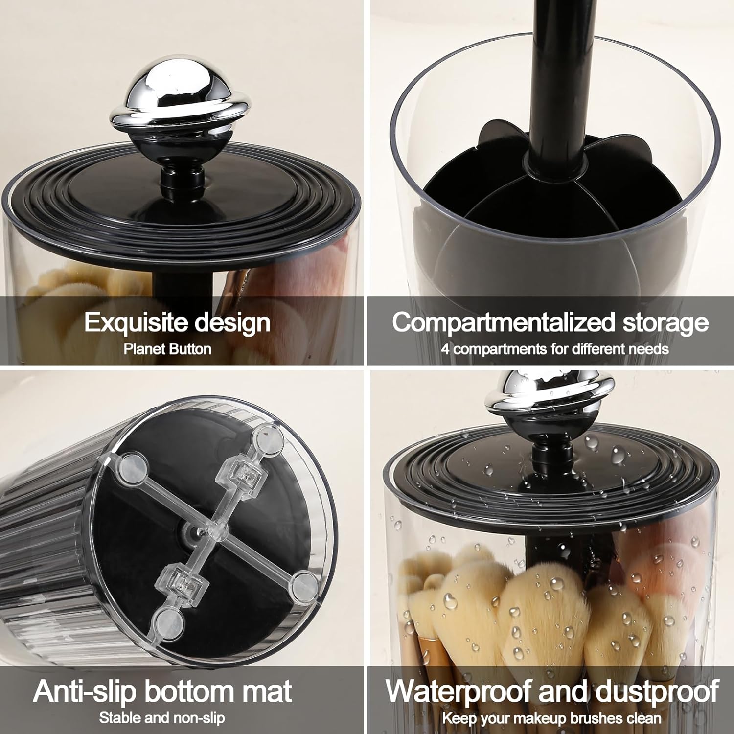 - 2.Large Capacity with 4 Slots:It has built-in 4 compartments with storage height up to 7.3in/18.5cm, which can help you sort your makeup brushes neatly.And the transparent material keeps your makeup brushes in order and clearly visible at all times.