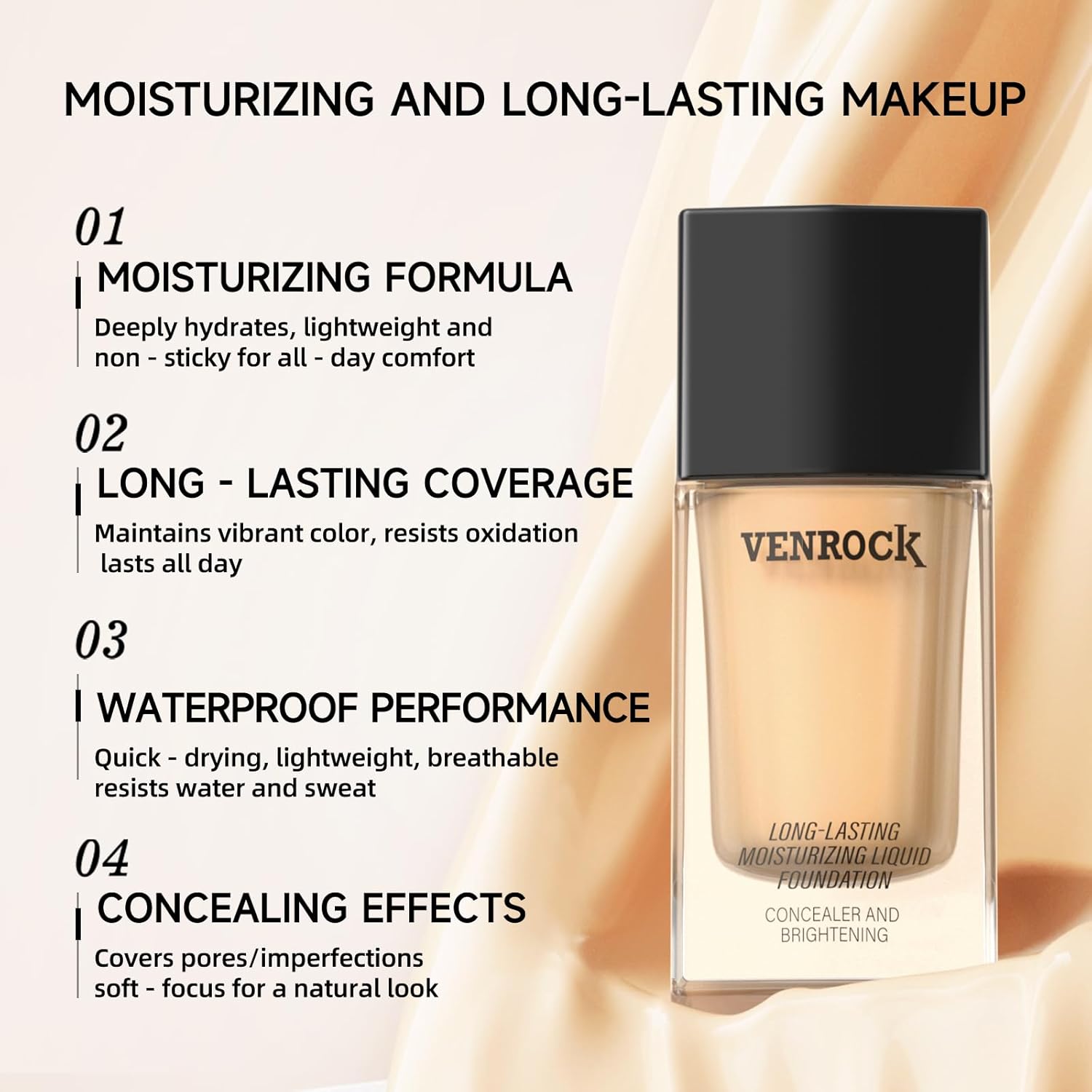 VENROCK 24HR Long-Lasting Moisturizing Liquid Foundation | Radiant, Waterproof, Concealing & Oil-Control (01# Ivory White, 30ml)