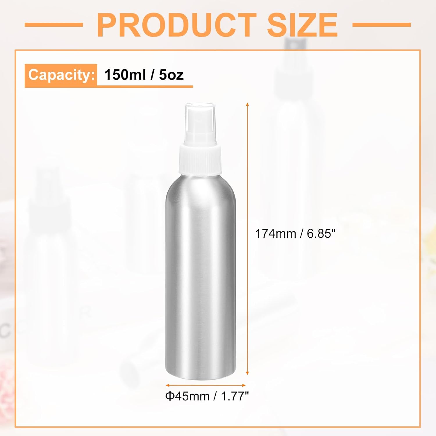 - Size - 150ml / 5oz capacity ; Total Size: 174 x 45mm / 6.85" x 1.77"(L*W). The nozzle design can spray a uniform and delicate atomized liquid, which can be used to store perfume, toner, lotion, spray or other liquids, etc.
