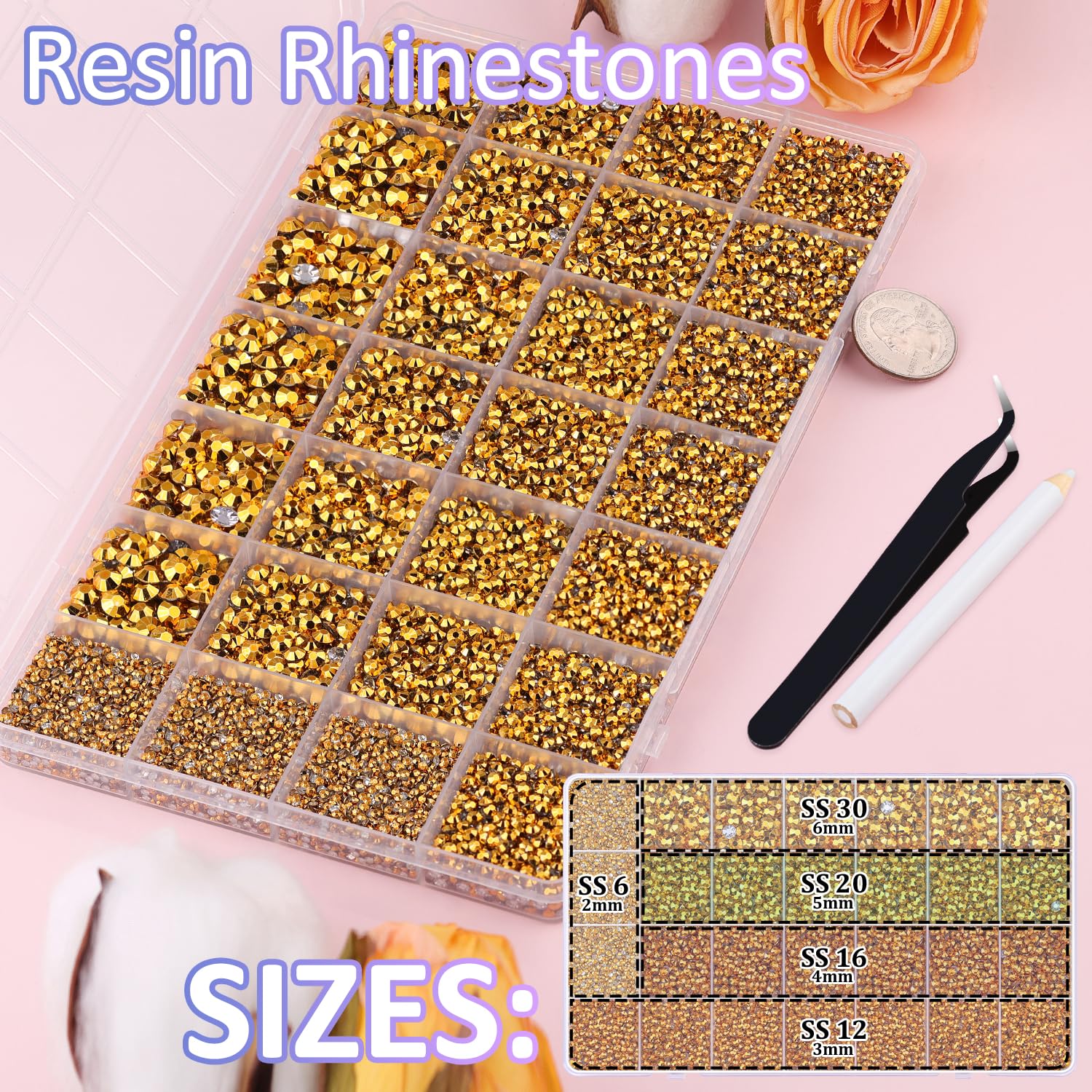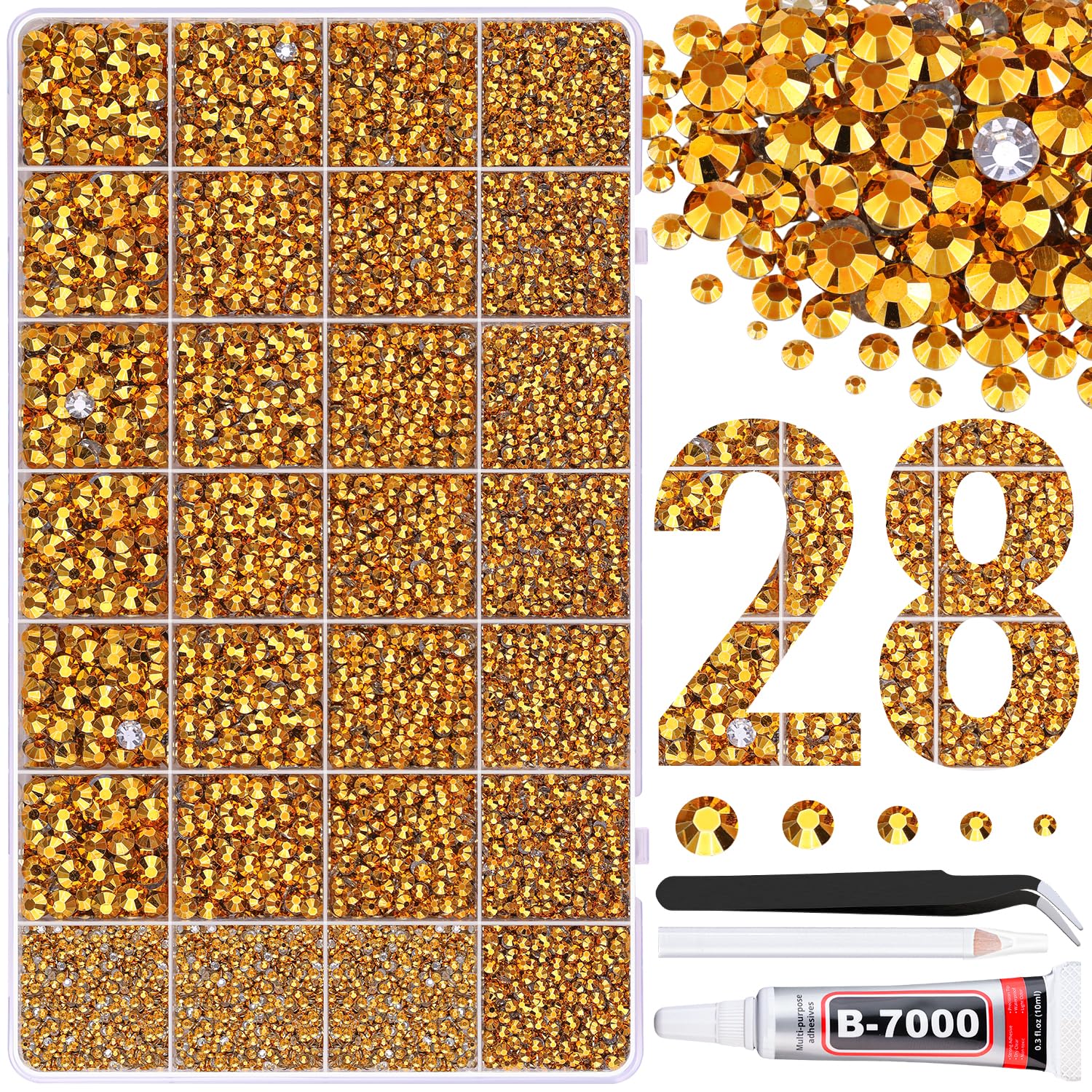 - PACKAGE CONTENT -- Include 1 box with 28 grids, featuring a variety of sizes, approx. 30000 pcs bling-out resin rhinestones. 1 tweezers and 1 pickup pen are included for easily picking up gems. 1 B7000 adhesive jewels glue for jewelry making