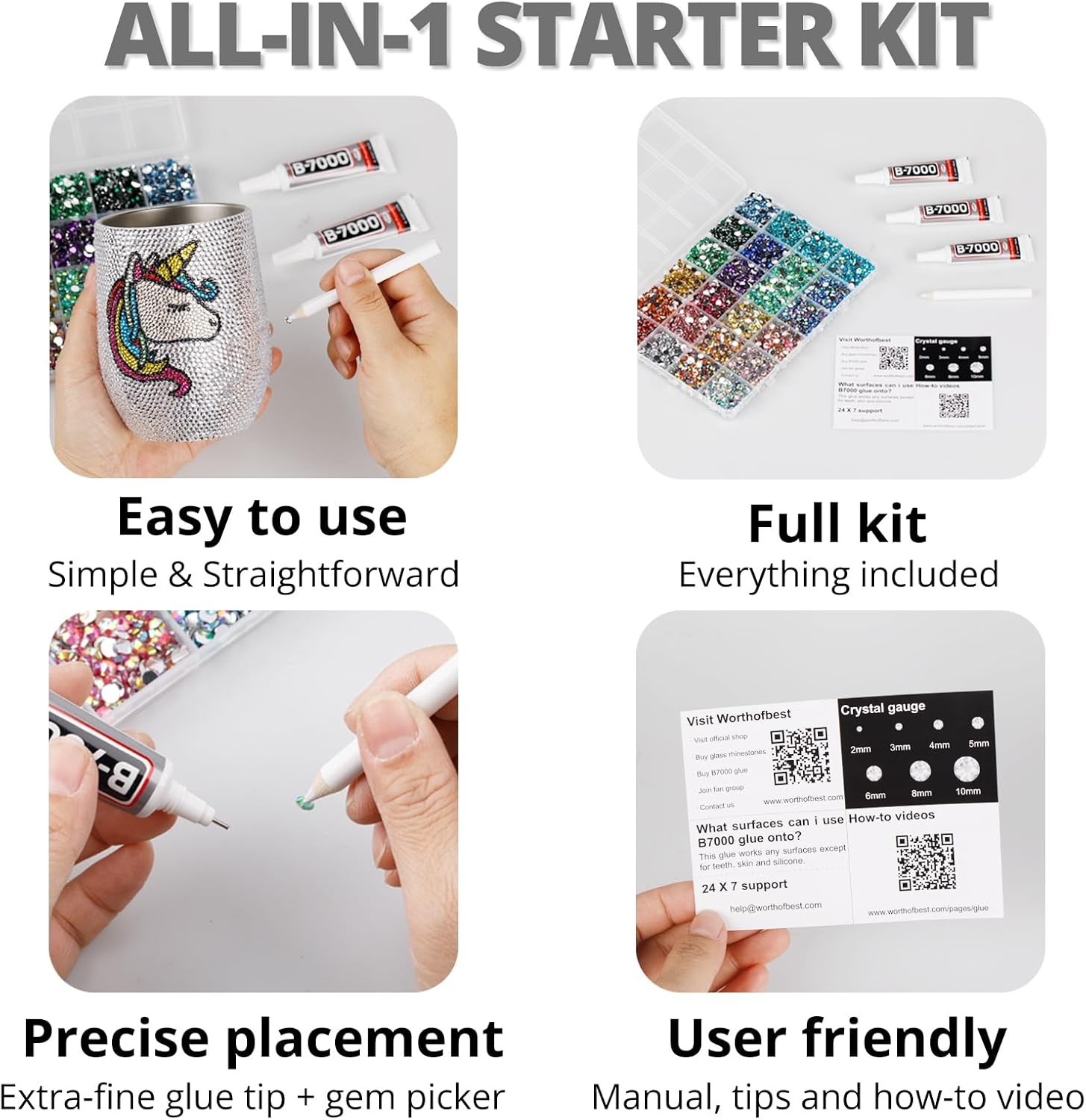 - Easy to Use -- This kit is designed to be straightforward, and versatile for various crafting projects. The manual is user-friendly and beneficial for both novice and experienced crafters. The complete and durable tools are suitable for precisely applying rhinestones to create intricate designs, with no additional tools required. Rhinestones are easy to apply and remove. The sturdy container with 24 grids keeps all rhinestones organized by size and color, making them easy to store and access