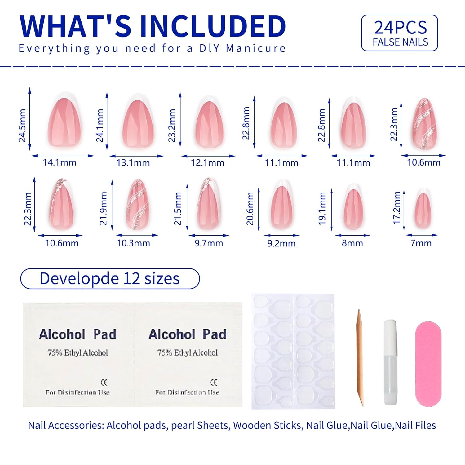 - Package Includes: 24 pcs stick on false glue on nails kit, each box includes 24 short press on nails, 1 sheet of 24 sticky nail pieces, 1 cuticle stick, 1 double sided nail file and gel press on nails cleaning pads, a small tube of nail glueďźAll the tools you need to apply the nails are included in one set