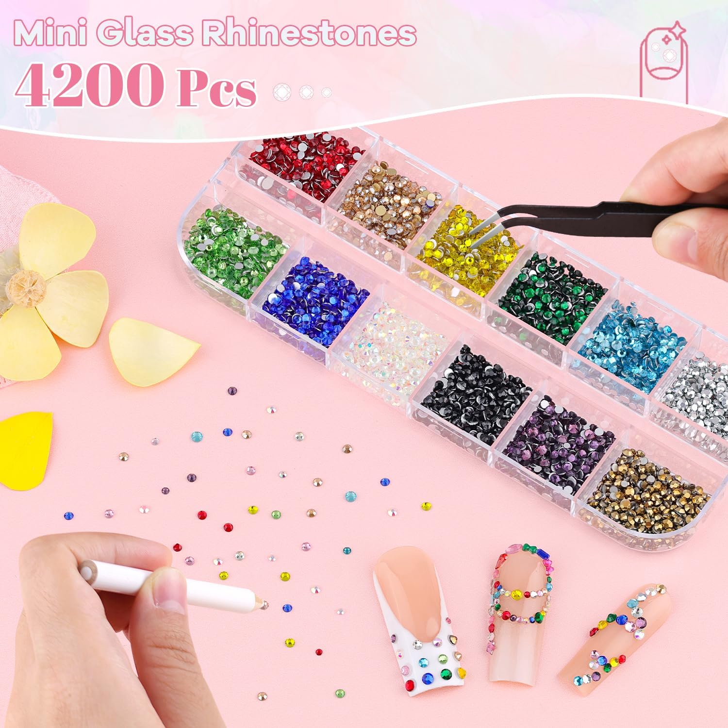 - Package Content -- One package includes approx. 4200 pcs (1.2/1.5/2/2.3 mm) Multicolors mini nail gems, 1 tweezers, 1 pick-up pencil and 15 ml rhinestone glue gel. The nail kit with sufficient tools can easily meet your nail design needs at home