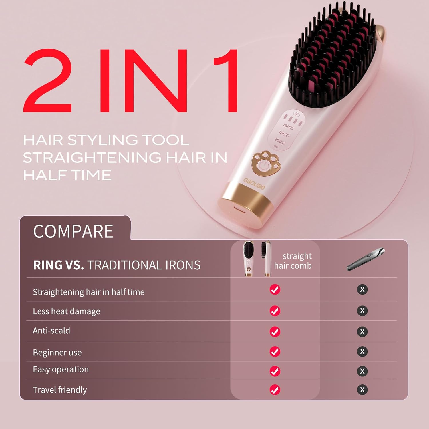 - TRAVEL-FRIENDLY CORDLESS FLAT IRON FOR EFFORTLESS STYLING ANYWHERE: Weighing just 8oz, the GSOUSG hair straightener brush features a cordless design that allows you to style your hair anywhere without searching for outlets or dealing with tangled cords. Perfect for styling before work, client meetings, and after workouts. *Please note: Charger not included.*