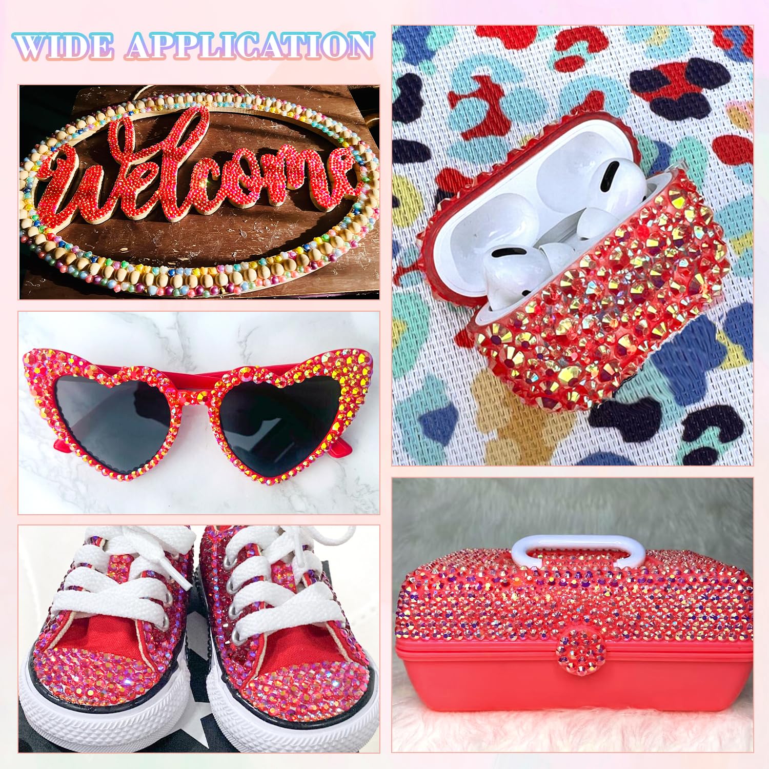 - PACKAGE CONTENT – This all-in-one bedazzler kit includes everything you need to start creating dazzling designs: 1 box of Red AB rhinestones with 24 grids (approx. 30,000 pcs of bedazzling rhinestones assorted size SS6/10/16/20/30 ), 1 precision tweezers, 1 pickup pen for handling small gems, and 3 tubes of B7000 jewelry glue for secure application.