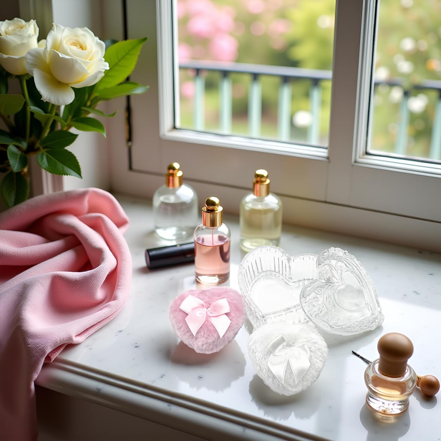 - PACKAGE INCLUDES 1 x Heart Shaped Glass Powder Puff Box with Reusable White and One Pink Puff Transparent glass material with heart shaped design, both aesthetics and ritual, suitable for gifts or makeup table decorations. The tassel is soft and reusable, can be used wet and dry