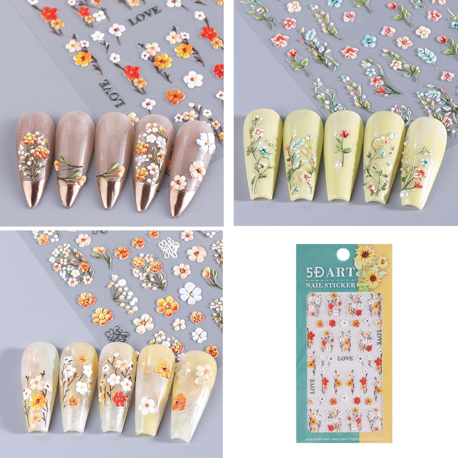 - Spring Floral Leaf Plant Self-Adhesive Design: 5D cute nail decals for nail art design is simple and quick to use, nail stickers work great on bare nails, they will stay on for a long time and will not peel off your nails, enjoy the feeling of nail art