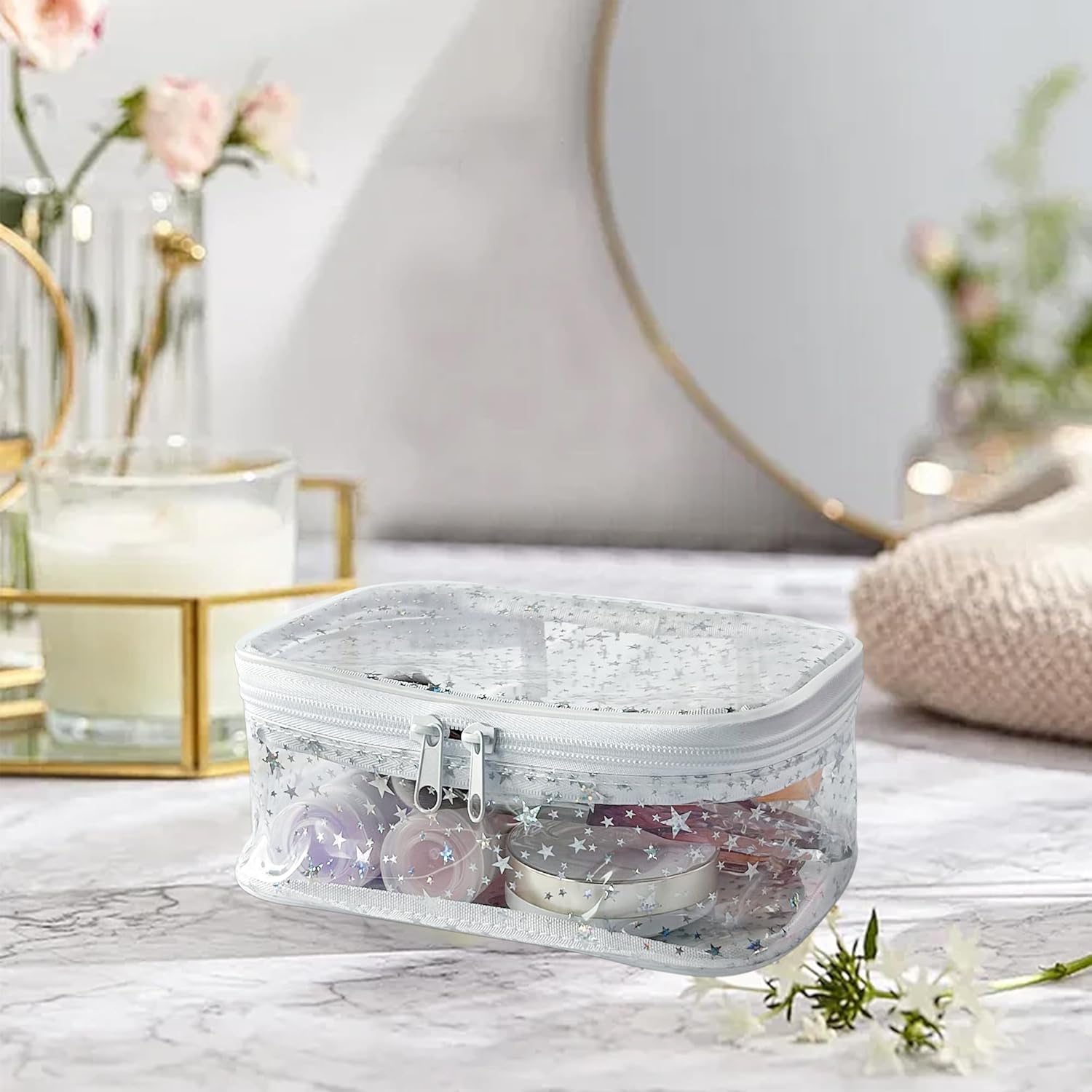 - đˇăDouble Metal ZippersăThe zipper closure of our shiny makeup bag is smooth and secure,providing easy access to your belongings.You can quickly find and retrieve items within seconds,without the fear of them falling out or getting lost