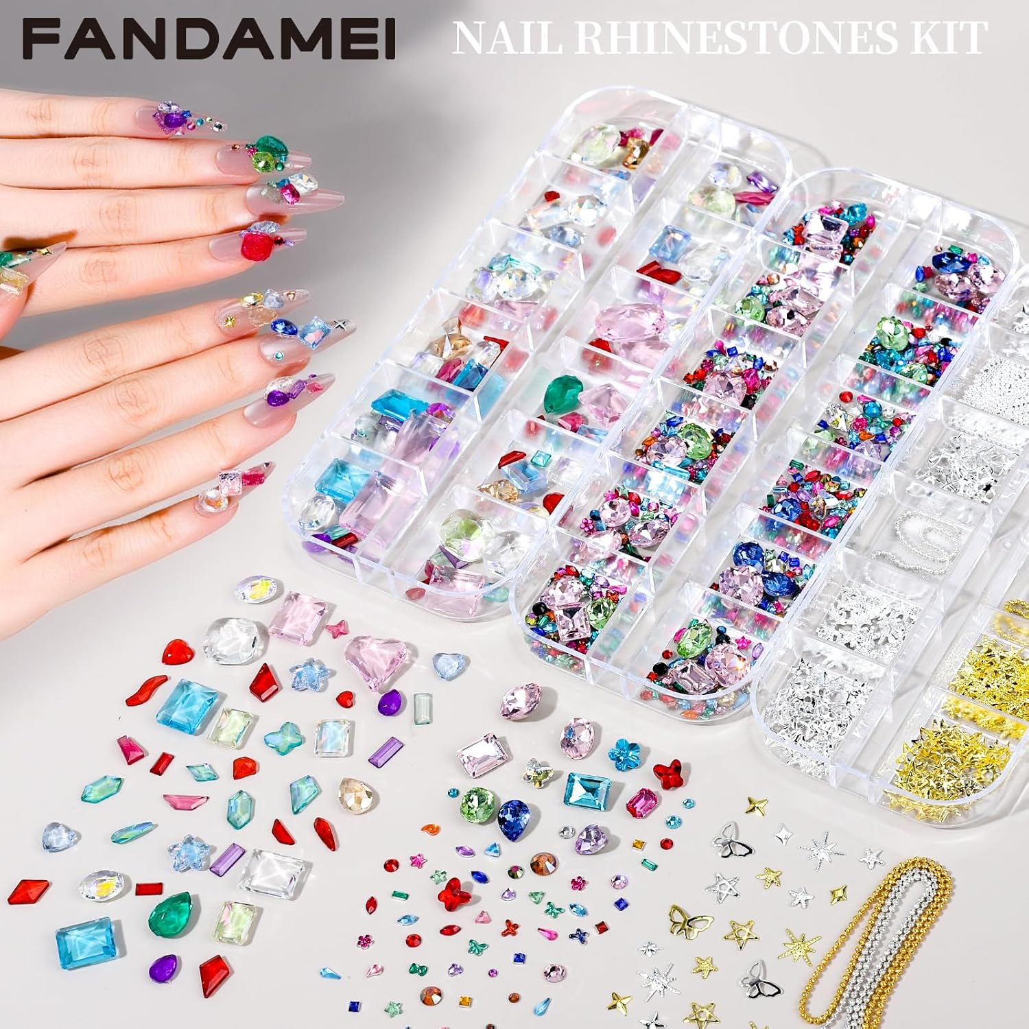 FANDAMEI Nail Gems, 3-Box Colorful Nail Rhinestones Nail Charms and Gems, 3D Rainbow Crystal Nail Diamonds Bulk, Mix-Size Flatback Gems for Nails, Gold Silver Nail Studs Beads for Nail Design