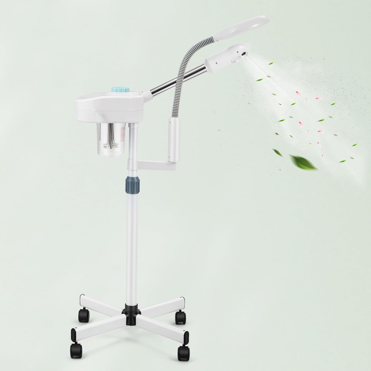 - 【Mobile Stand with Adjustable Sprayers】4-wheeled base moves freely around your space. Adjustable height + 180° rotating nozzles target steam to face/sinuses—ideal for sinus relief or facial deep cleaning
