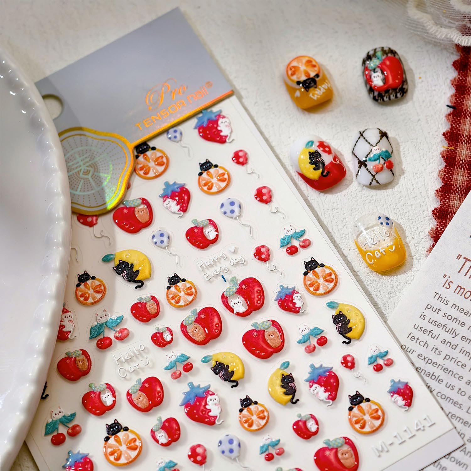 Apple Nail Art Stickers Cat Nail Decals for Nails Art Cute Nail Stickers Red Orange 5D Embossed Self Adhesive Fruit Nails Charms for Women Girls Kid Manicure DIY Decoration Accessories