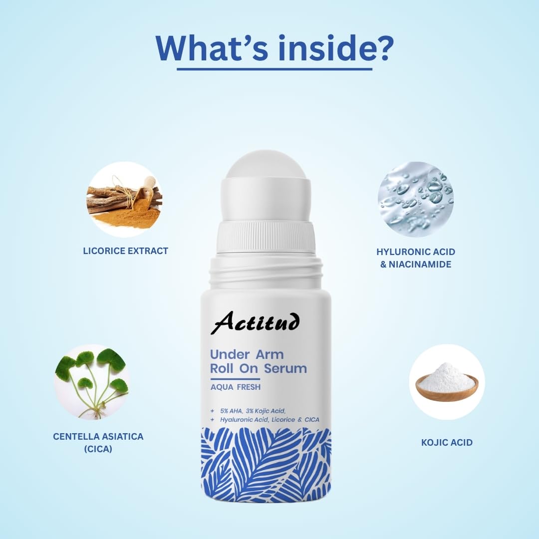Actitud Underarm Roll On Serum - Roll On Deo for Women & Men with 5% AHA &3% Kojic Acid for Brightening & Odour Control - No Alcohol & Long Lasting Aqua Fresh- 50ml