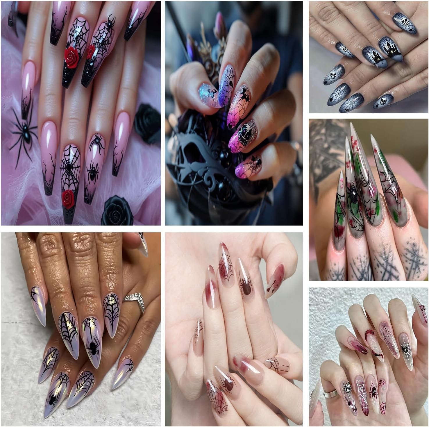 - Quantity:You will get 6 sheets 3D self -adhesive Halloween nail stickers, Each stickes size about 3.54x 2.55 inches(9x6.5cm). Blood spider web, black spider, blood drops, blue eye spider etc patterns design for your choice, these nail stickers are perfect for matching other nail art